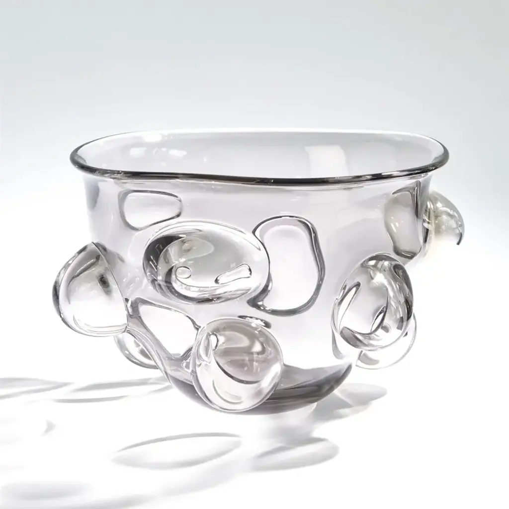 The Bubbled Bowl is made in a small art glass factory located in the south-eastern point of Poland. The artisans first form the smoke grey glass in a mold. Using a round tool, the interior bubbles in the abstract shape are pushed out of the wall of the bowl. Lastly, the glass is annealed for over 24hrs to cool. Each piece is unique, so shape and color may vary. From a fashion forward perspective, Global Views offers accessories, furniture, statement lighting, and an assortment of rugs and mirrors to add beauty and joy to your home.
