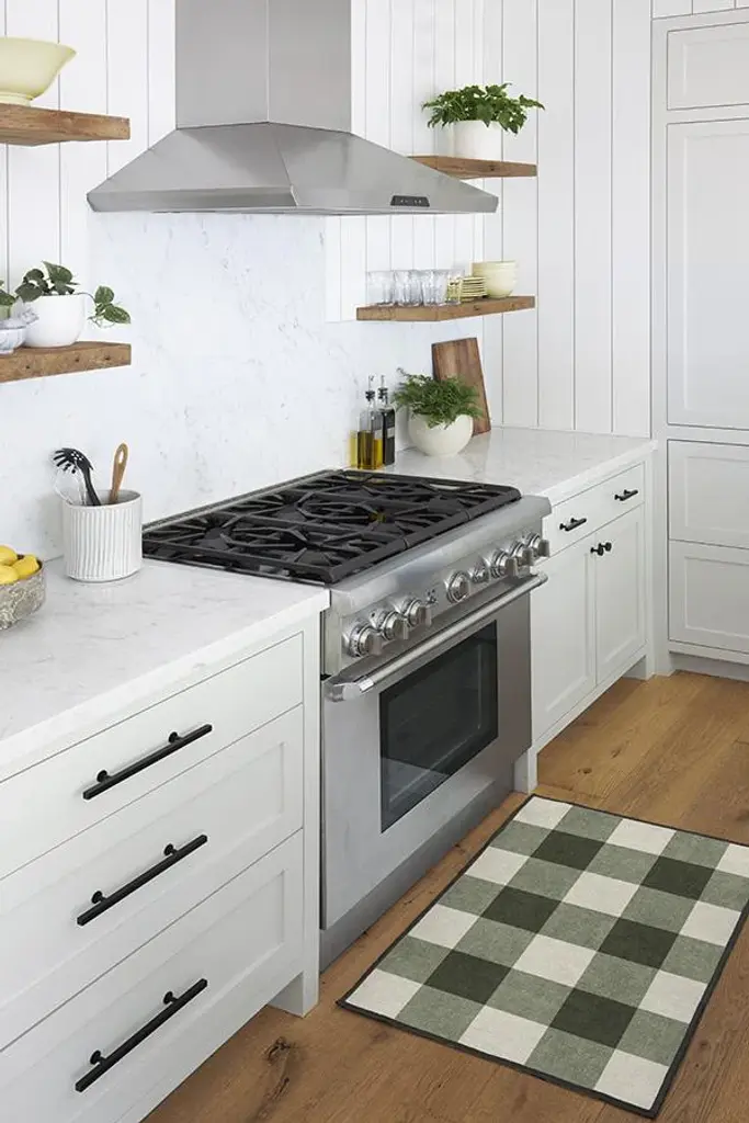 Classic and charming, our Buffalo Plaid Green & White Rug features shades of fern and pearl. This checkered rug design will surely complement any contemporary or classic-style homes. Water-resistant, stain-resistant, and machine-washable.