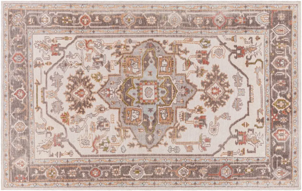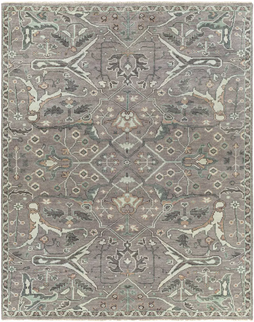 Collection: Bugasan Colors: Light Gray, Tan, Teal, Gray, Medium Brown, Plum Construction: Hand Knotted Material: 100% Wool Pile: Low Pile Pile Height: 0.11" Styles: Traditional Made In: India Thickness: 0.5" Fringe Length: 0.9" Price Range: $$$$$ (Premium)