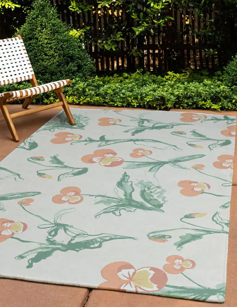 Relax in a field of wildflowers with the Bunch of Pansies Indoor/outdoor Rug from the Wildflower Desert Collection. Everyone will delight in the space defining design brought to your porch, patio, kitchen, or bathroom by this area rug. The artistic and colorful design is printed on a soft polyester base with a skid resistant backing, making it a perfect way to add color, flare and personality to any indoor or outdoor space. To clean, use a mild soap and lay flat to dry.