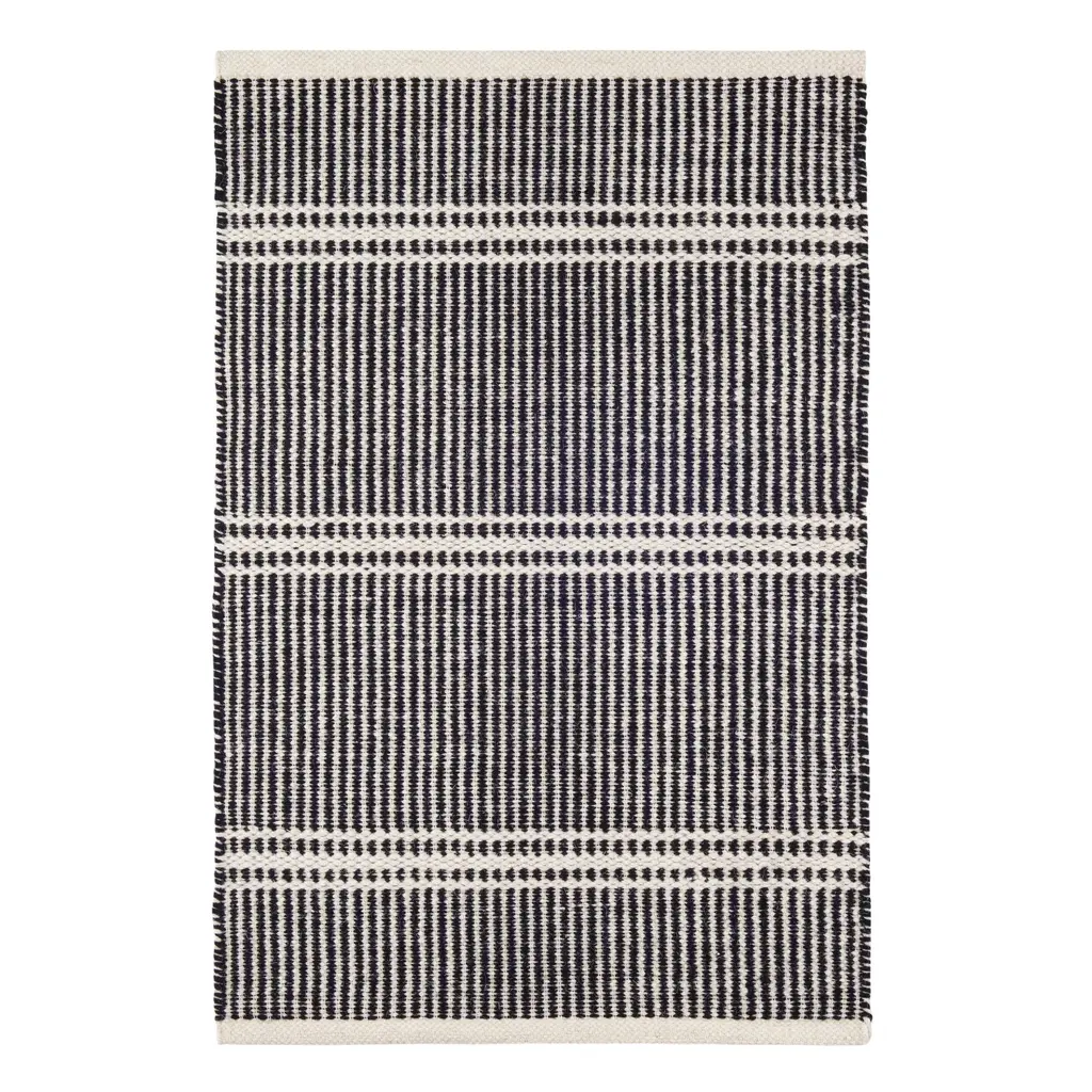 Part of our Bunny Williams collection, this delicately striped, black indoor/outdoor rug was inspired by an antique rug sample from the designer's own personal collection. Regular vacuuming and the occasional gentle shake should keep your rug in shipshape condition. For P.E.T. rugs, we recommend lightly brushing with fresh or soapy water, or spray with a hose. Do not machine wash or dry.