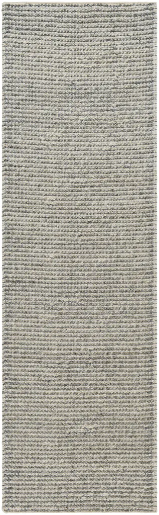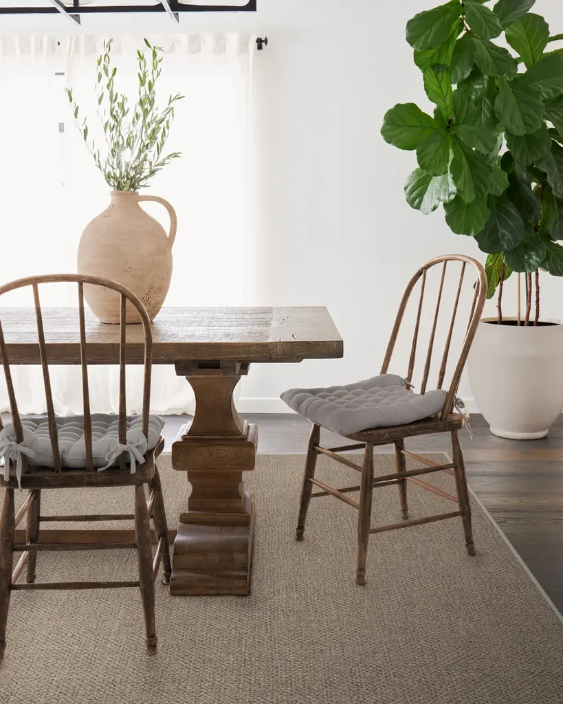 A classic rug that goes with everything. Light grey and natural colors blend to create a pretty burlap look. Its woven texture mimics jute and is both washable and easy to clean. Made with recycled + virgin polyester, and polyurethane.
