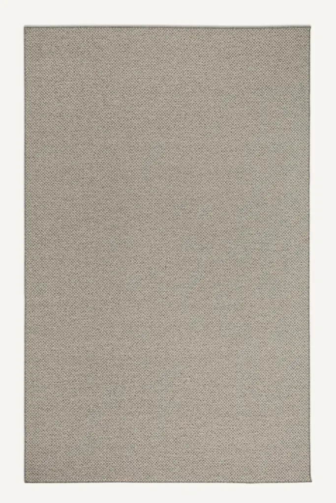 A classic rug that goes with everything. Light grey and natural colors blend to create a pretty burlap look. Its woven texture mimics jute and is both washable and easy to clean. Made with recycled + virgin polyester, and polyurethane.