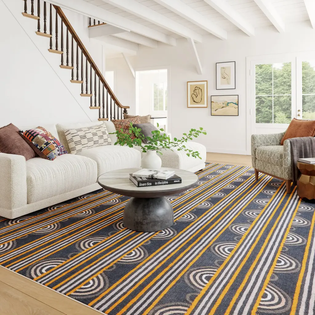 A modern geometric design is brought to life on this synthetic rug. Its washable, easy-to-clean construction makes it a practical and stylish choice for any room.