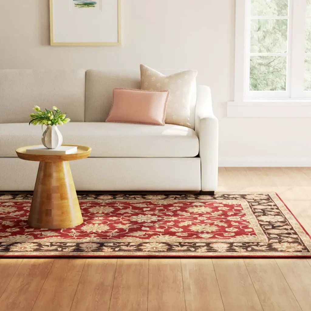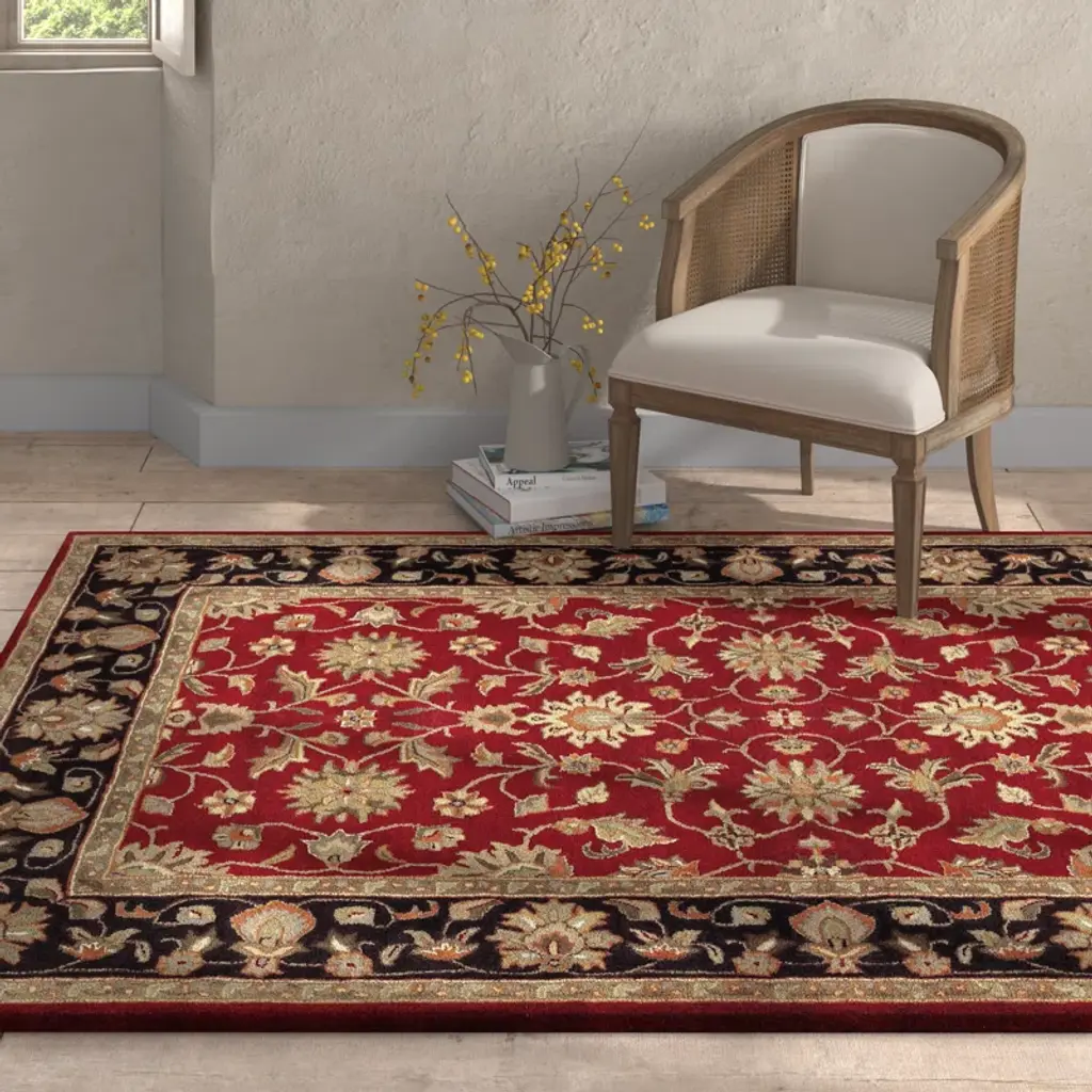 This oriental rug has a certain heirloom charm, right out of the box. It's handmade in India from 100% wool, with a classic, geometric floral pattern that's sure to fit right in with your traditional decor. It's hand-tufted with a medium-thick, 0.5'' pile height, so it's just right for adding some softness to your living room floors, while holding up to high foot traffic and vacuuming. This wool rug features garnet red, tan, and black hues that are easy to match. We suggest putting a rug pad underneath to keep it safely in place.