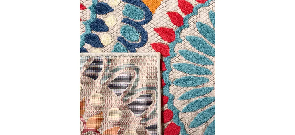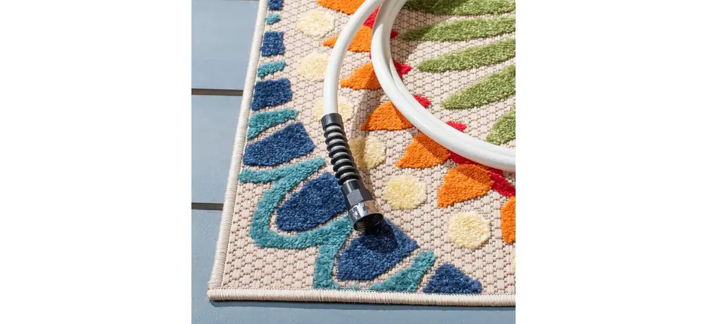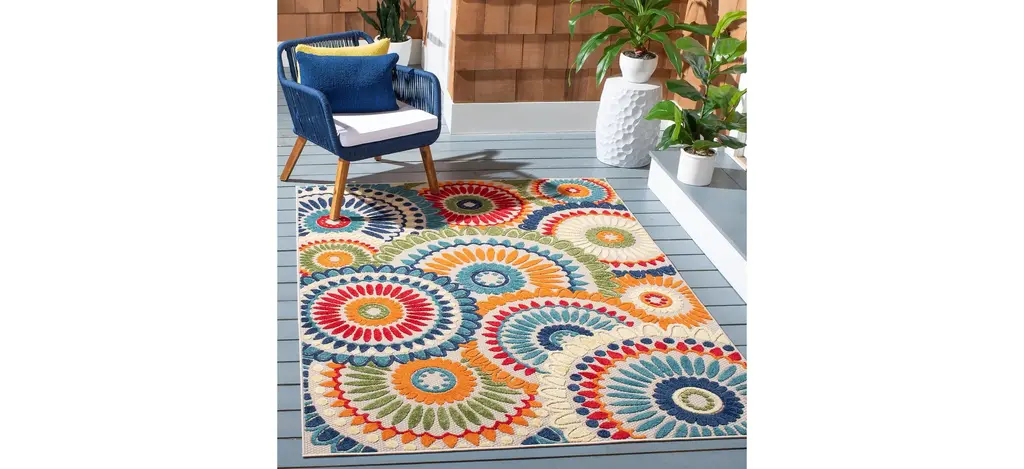 The Cabana II Area Rug offers an elaborate floor covering for any busy area of the home, inside or out. The playful motif brims with "staycation" vibes on any deck, porch, or patio. It is made using durable synthetic yarns for resistance to weather, wear, mold, mildew, and fading from the sun.