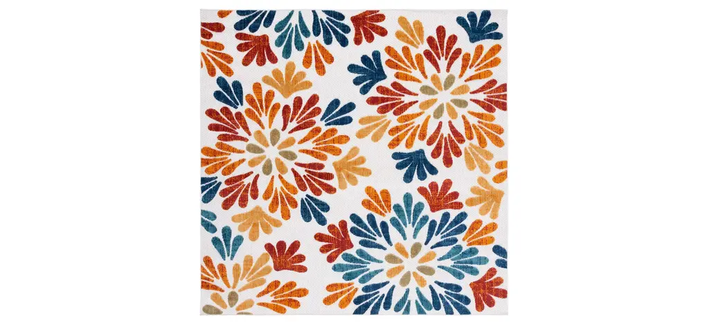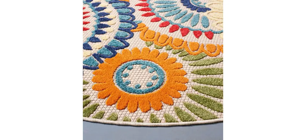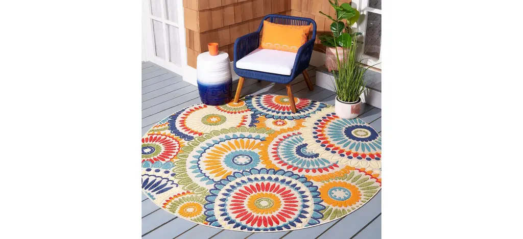 The Cabana II Area Rug offers an elaborate floor covering for any busy area of the home, inside or out. The playful motif brims with "staycation" vibes on any deck, porch, or patio. It is made using durable synthetic yarns for resistance to weather, wear, mold, mildew, and fading from the sun.
