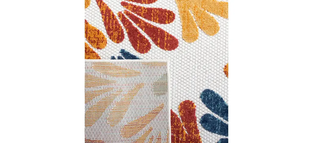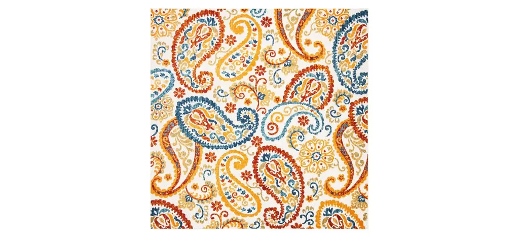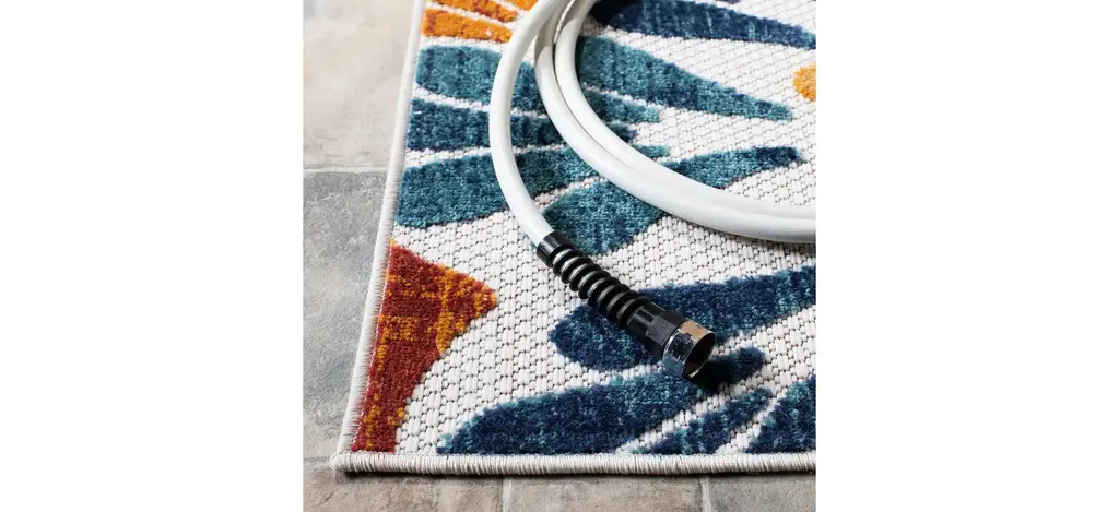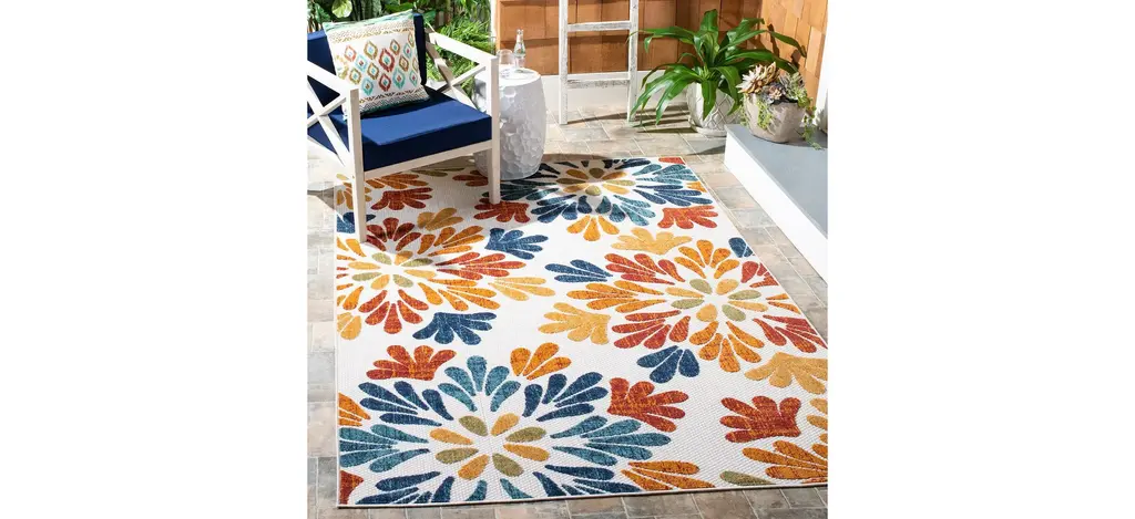 The Cabana IV Area Rug offers an elaborate floor covering for any busy area of the home, inside or out. The playful motif brims with "staycation" vibes on any deck, porch, or patio. It is made using durable synthetic yarns for resistance to weather, wear, mold, mildew, and fading from the sun.