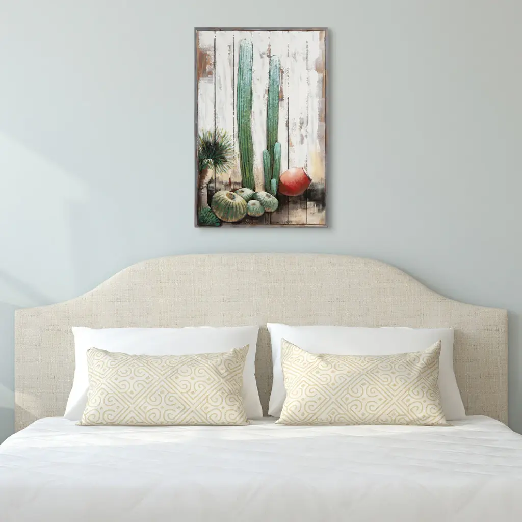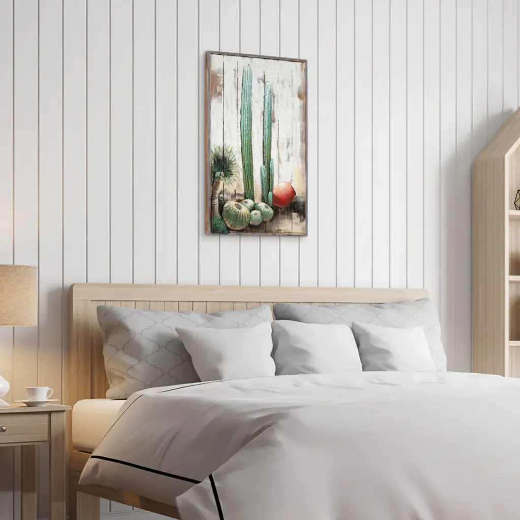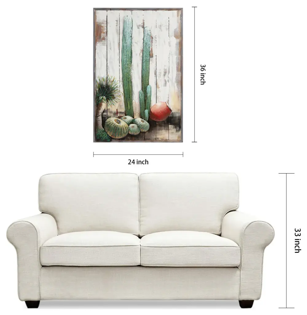 Empire Art Direct and their exclusive artist Primo are proud to present this three-dimensional, iron, mixed media wall sculpture on slatted solid wood. These individual unique originals are hand painted and signed works of art that are renown for Primo''s skills of manipulating iron into a textured work of art with extraordinary depth and skill. This 3D sculpture of cacti can be presented outdoors if it is varnished every year, as it will take on a patina characteristic that is inherent in its presentation.