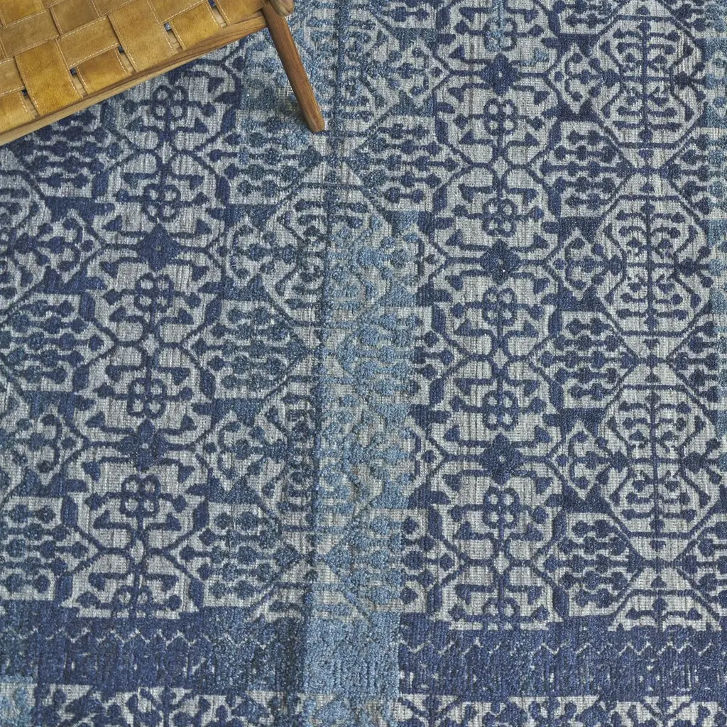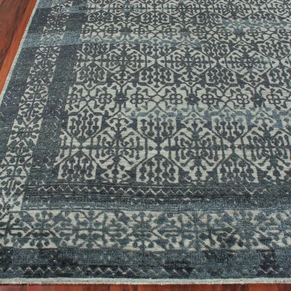 Hand-knotted of New Zealand wool, prized for its softness and durability, this rug features an elaborate raised motif on a low-pile foundation. Variations in the blues and grays give it the artisanal allure of a treasured heirloom. A rug pad is recommended to help prevent slipping.