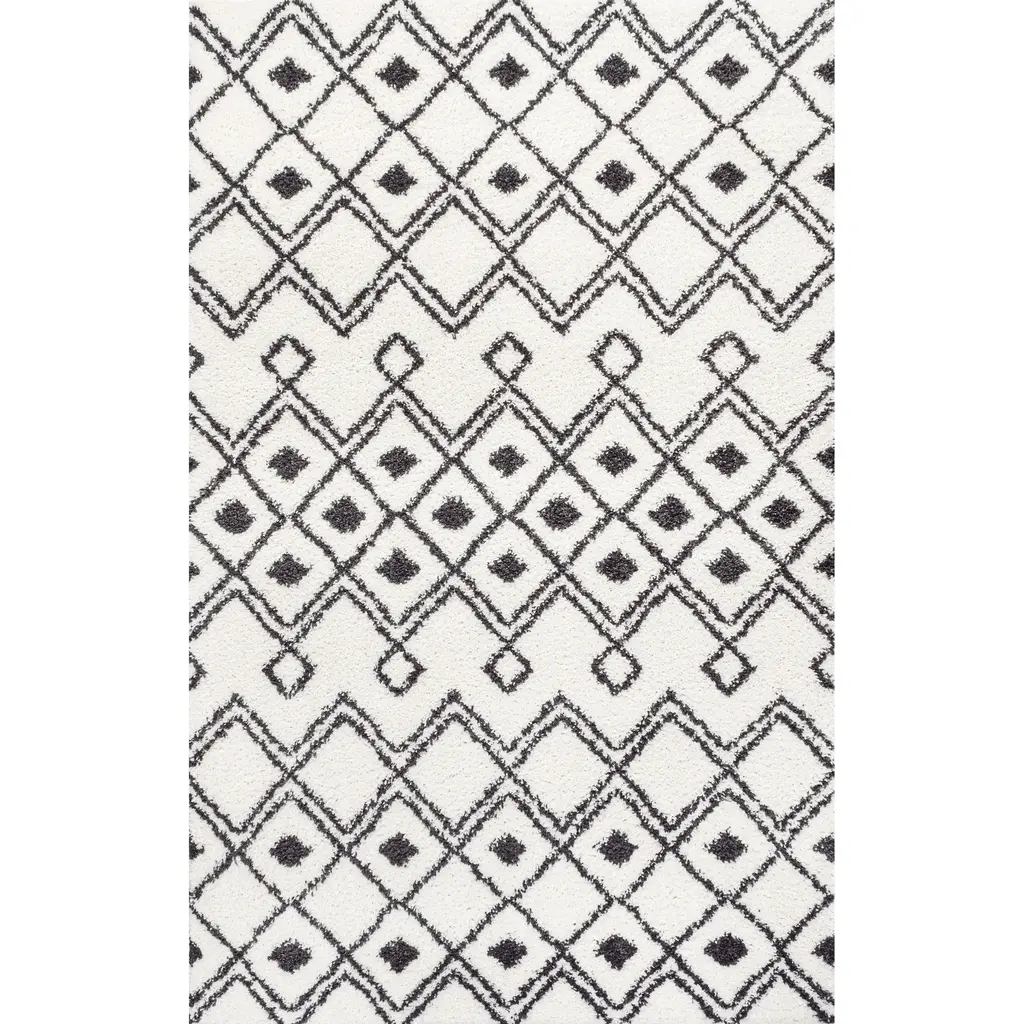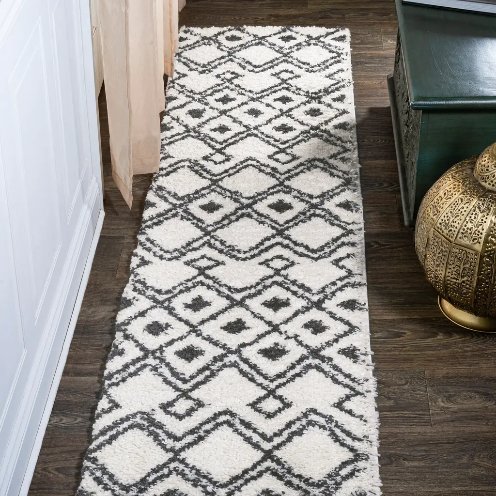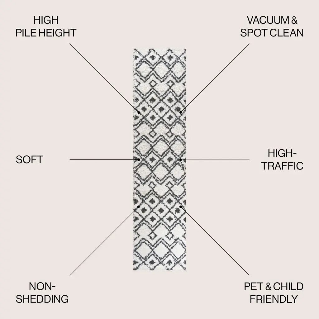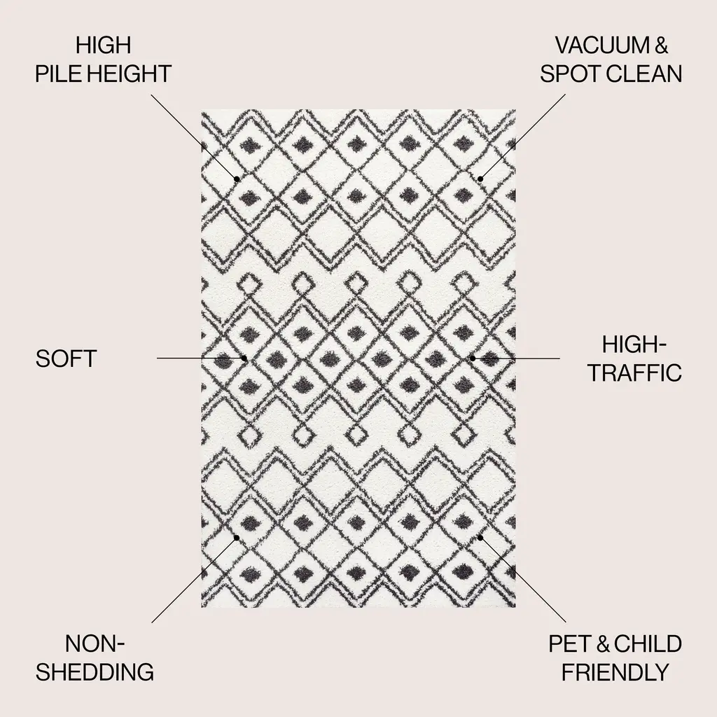 Inspired by vintage Beni Ourain Moroccan rugs, our soft and fluffy shag yarns make it easy to go barefoot. The classic Moroccan pattern has diamonds and dots on a field. Anchor your Bohemian space; add softness to a bedroom, living room, or cozy reading nook; this is a low-pile shag rug with timeless style.