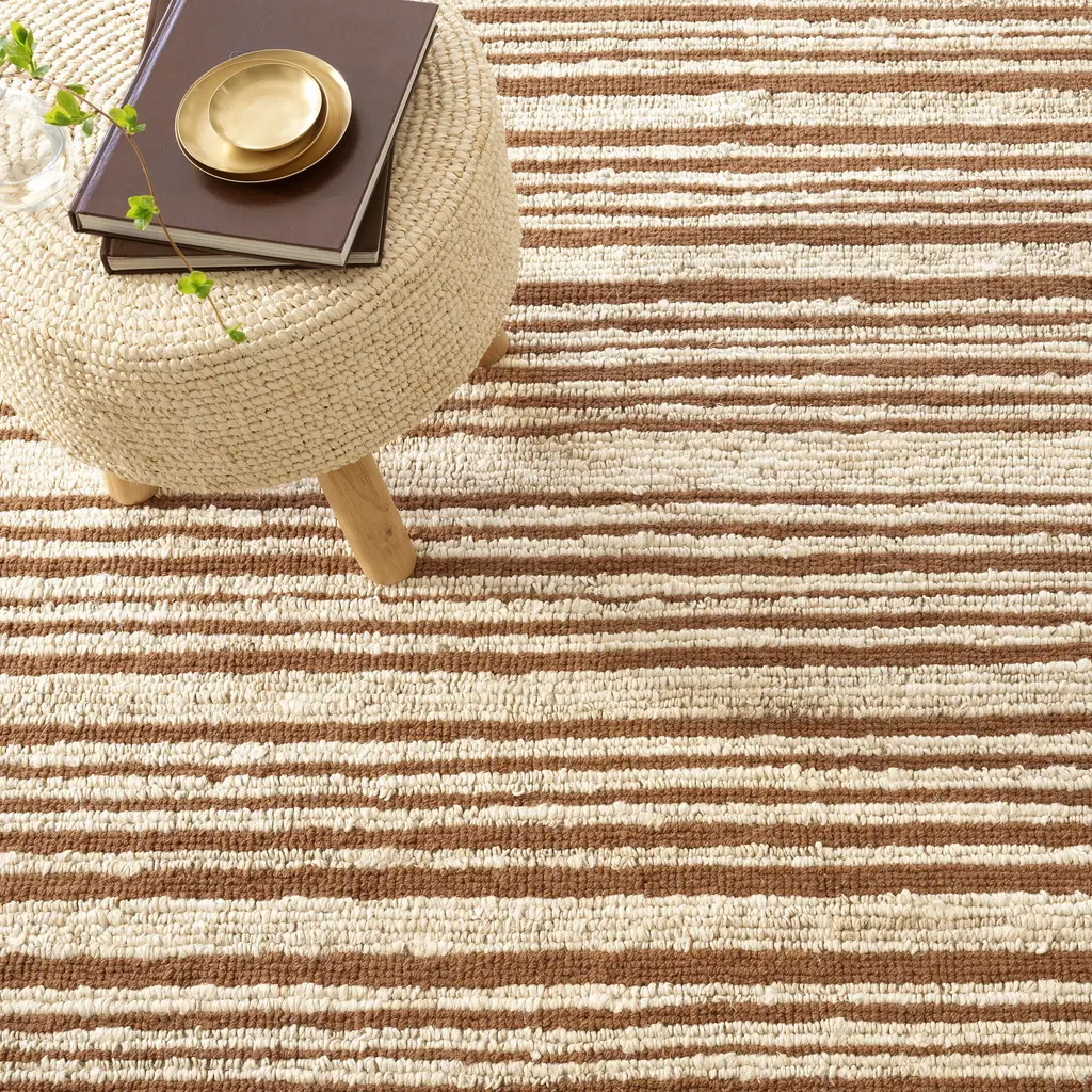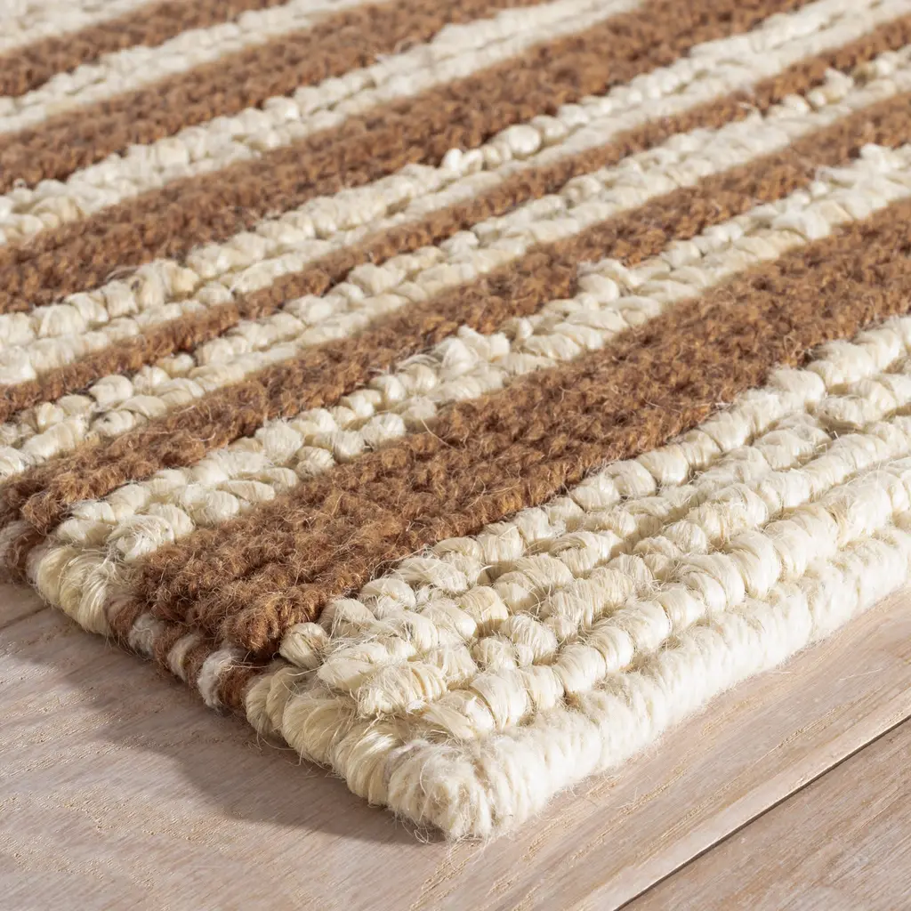 Need a good reason to look underfoot? This durable, sustainable jute rug will add a cushiony, chunky dose of casual character and welcoming soul to your home. Undyed looped stripes are handworked to give a slubby twist to the fiber. The dense curly surface texture alternates with nubby wool stripes in soft, earthy, mineral shades. Part of a collection designed by Marie Flanigan, the Architect, Designer, Founder, and Principal of Marie Flanigan Interiors whose signature style is imbued with timeless elegance and innovative simplicity.