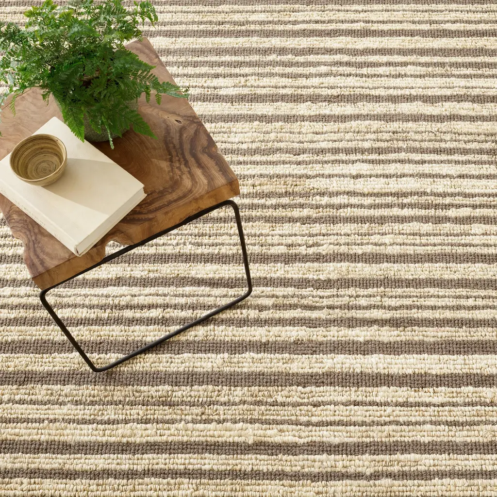 Need a good reason to look underfoot? This durable, sustainable jute rug will add a cushiony, chunky dose of casual character and welcoming soul to your home. Undyed looped stripes are handworked to give a slubby twist to the fiber. The dense curly surface texture alternates with nubby wool stripes in soft, earthy, mineral shades. Part of a collection designed by Marie Flanigan, the Architect, Designer, Founder, and Principal of Marie Flanigan Interiors whose signature style is imbued with timeless elegance and innovative simplicity.
