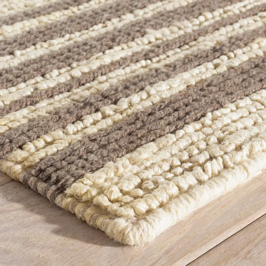Need a good reason to look underfoot? This durable, sustainable jute rug will add a cushiony, chunky dose of casual character and welcoming soul to your home. Undyed looped stripes are handworked to give a slubby twist to the fiber. The dense curly surface texture alternates with nubby wool stripes in soft, earthy, mineral shades. Part of a collection designed by Marie Flanigan, the Architect, Designer, Founder, and Principal of Marie Flanigan Interiors whose signature style is imbued with timeless elegance and innovative simplicity.