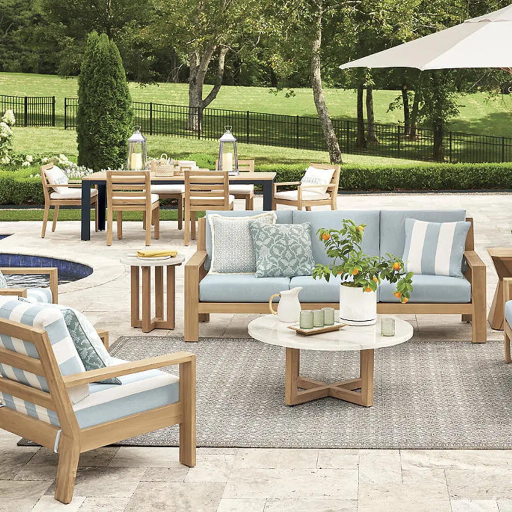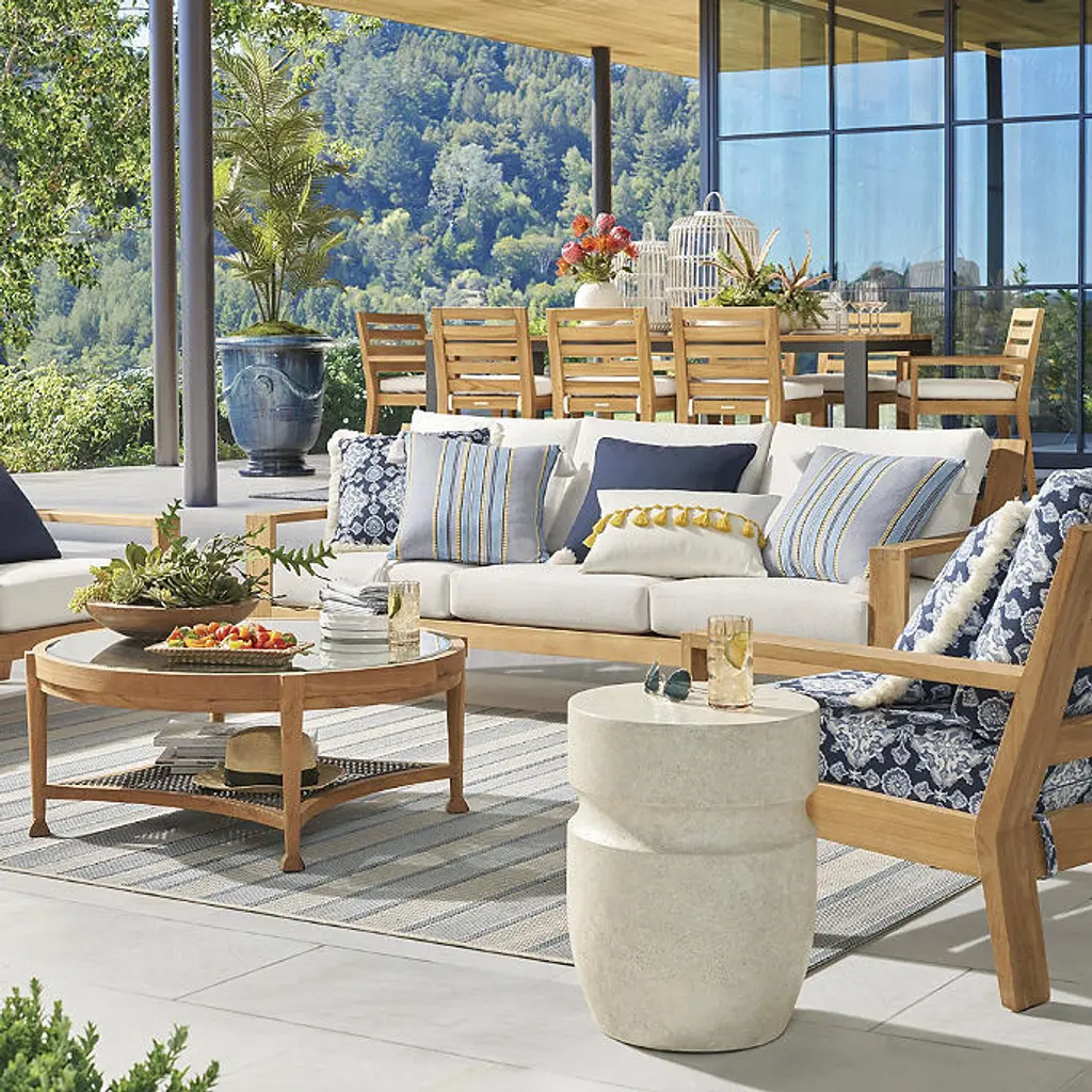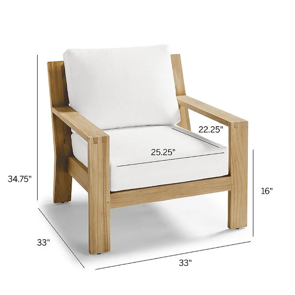 The Calhoun Teak Lounge Chair's clean lines and generously sized armrests create a simple, yet classic look that elevates any outdoor space. Frames are handcrafted of high-quality teak that has been kiln dried to eliminate expansion and shrinkage. Included cushions are upholstered in 100% solution-dyed acrylic fabric.Contract-gradeHand-built from sustainably harvested, high-quality teak that is naturally resistant to mildew, so it holds up to rain and humidityDurable teak frame is kiln dried to remove moisture, guarding against warping and cracking, and sanded by hand so it's smooth to the touchTeak naturally releases resinous oils as it weathers; using a rug is recommended to help prevent staining of deck or patio surfaces Over time, teak will develop a natural silver patina if left untreatedFrame is backed by an industry-leading 10-year structural warrantyIncludes seat cushions and back cushions All-weather cushions have a high-resiliency foam core wrapped in plush polyester 100% solution-dyed fabric resists mold, mildew and fading - and is easy to cleanArrives assembledImported A Frontgate exclusive.Type of Cushion: Standard: Multiple layers of high-resiliency, high-density foam core with soft polyester wrap.Quick Dry: Faster drainage and 35% faster dry time. Open-cell foam wrapped with densified polyester and a quick-dry center, lined for extra comfort. Removable cover has mesh panel on the bottom for maximum drainage.At Frontgate, our primary focus is quality. We guarantee that every product we sell will stand up to the supreme test – our customers' satisfaction. To learn more about our policies, visit our Shipping & Processing, Returns & Exchanges and Warranty & Price Guarantee pages.Please Note: Digital renderings are available in select fabric options. If a digital rendering is not available, we recommend ordering a swatch before completing your order. Digital renderings of custom upholstery may differ in pattern placement from the actual item. Because colors can vary from screen to screen, we recommend ordering a swatch before completing your order.We offer free swatches of all our fabrics. 10-swatch maximum. Solid and stripe swatches measure 4"x4" and pattern swatches measure 8"x8". View and order swatches here.
