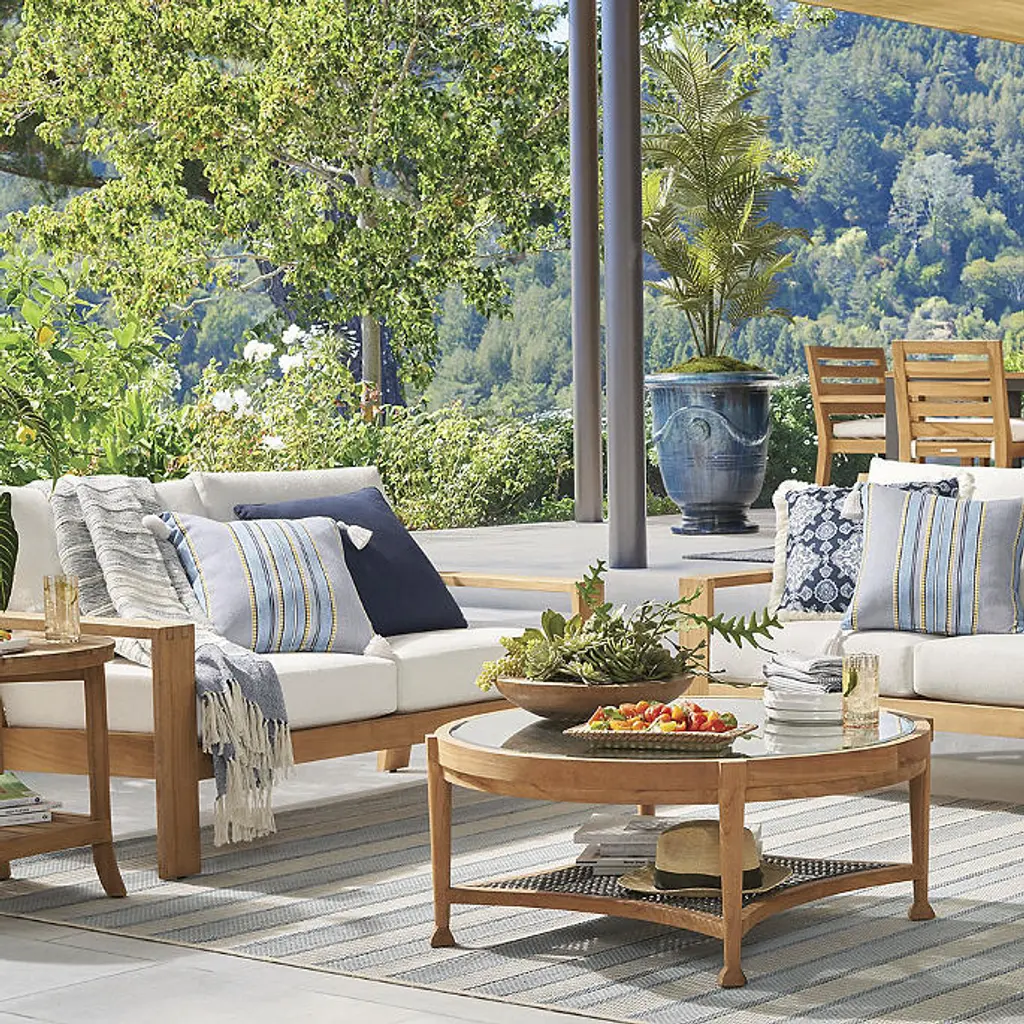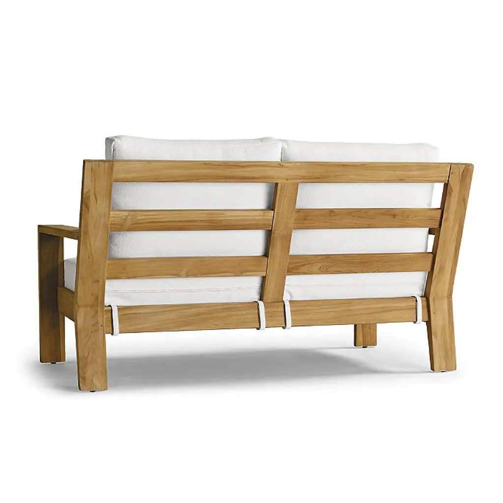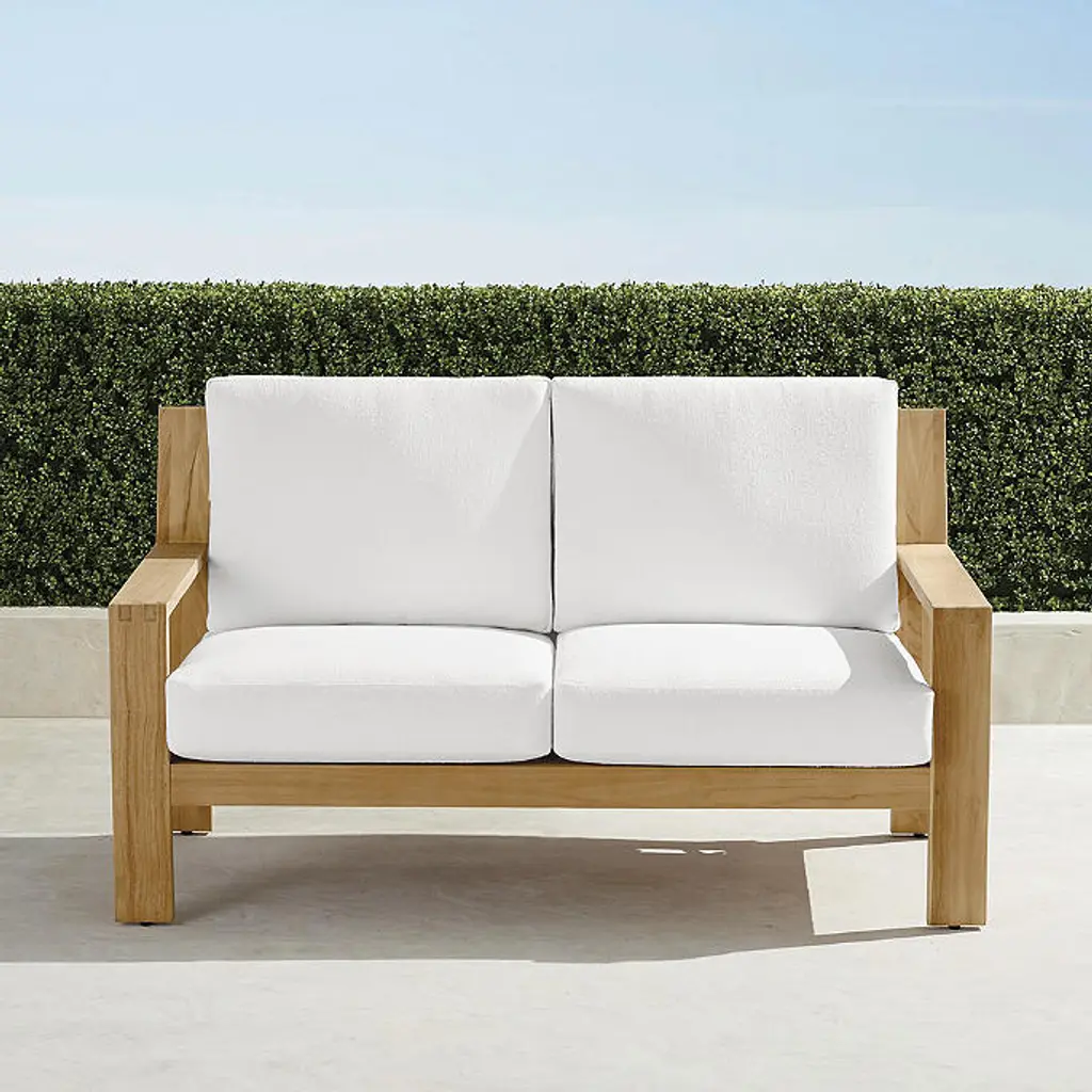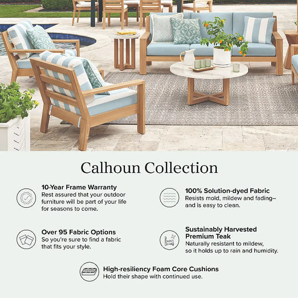 The Calhoun Teak Loveseat's clean lines and generously sized armrests create a simple, yet classic look that elevates any outdoor space. Frames are handcrafted from of high-quality that has been kiln dried to eliminate expansion and shrinkage. Included cushions are upholstered in 100% solution-dyed acrylic fabric.Hand-built from sustainably harvested, high-quality teak that is naturally resistant to mildew, so it holds up to rain and humidityDurable teak frame is kiln dried to remove moisture, guarding against warping and cracking, and sanded by hand so it's smooth to the touchTeak naturally releases resinous oils as it weathers; using a rug is recommended to help prevent staining of deck or patio surfaces Over time, teak will develop a natural silver patina if left untreatedFrame is backed by an industry-leading 10-year structural warrantyIncludes seat cushions and back cushions All-weather cushions have a high-resiliency foam core wrapped in plush polyester 100% solution-dyed fabric resists mold, mildew and fading - and is easy to cleanArrives assembledImported A Frontgate exclusive.Type of Cushion: Standard: Multiple layers of high-resiliency, high-density foam core with soft polyester wrap.Quick Dry: Faster drainage and 35% faster dry time. Open-cell foam wrapped with densified polyester and a quick-dry center, lined for extra comfort. Removable cover has mesh panel on the bottom for maximum drainage.At Frontgate, our primary focus is quality. We guarantee that every product we sell will stand up to the supreme test – our customers' satisfaction. To learn more about our policies, visit our Shipping & Processing, Returns & Exchanges and Warranty & Price Guarantee pages.Please Note: Digital renderings are available in select fabric options. If a digital rendering is not available, we recommend ordering a swatch before completing your order. Digital renderings of custom upholstery may differ in pattern placement from the actual item. Because colors can vary from screen to screen, we recommend ordering a swatch before completing your order.We offer free swatches of all our fabrics. 10-swatch maximum. Solid and stripe swatches measure 4"x4" and pattern swatches measure 8"x8". View and order swatches here.
