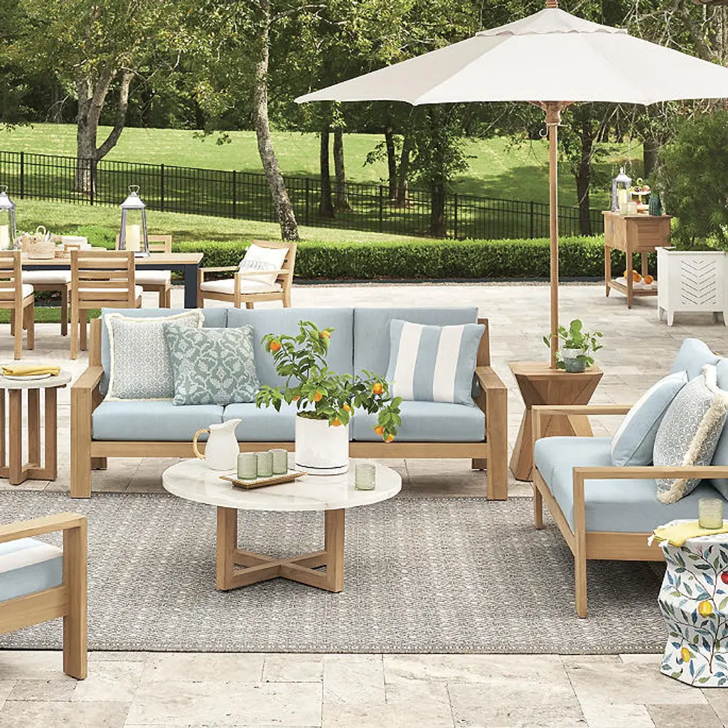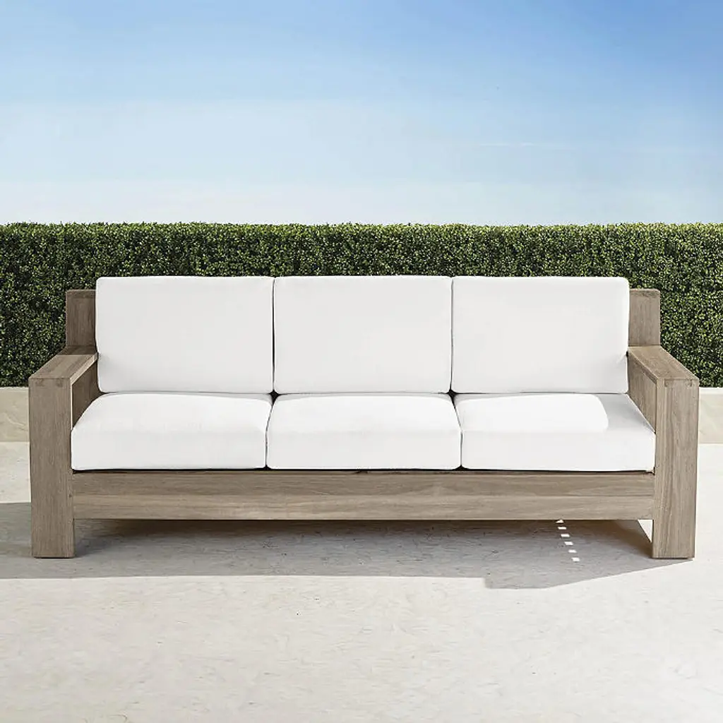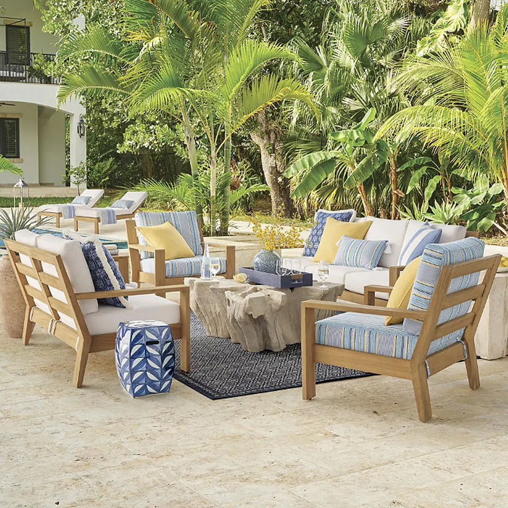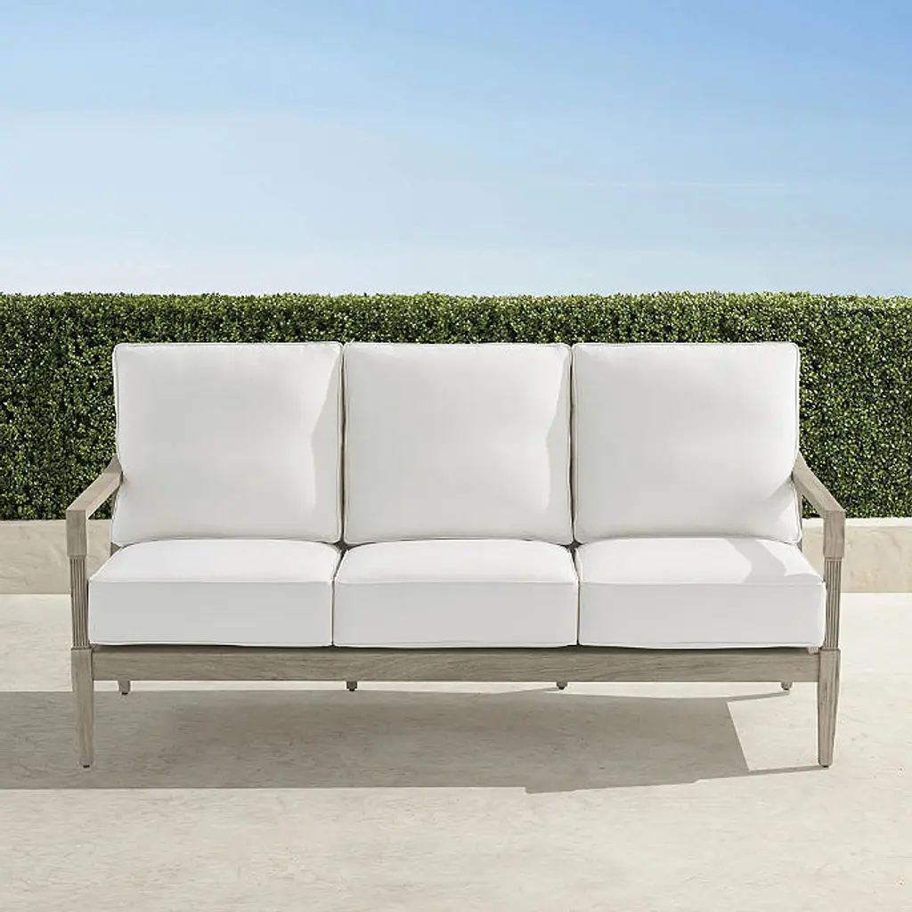 The Calhoun Teak Loveseat's clean lines and generously sized armrests create a simple, yet classic look that elevates any outdoor space. Frames are handcrafted from of high-quality that has been kiln dried to eliminate expansion and shrinkage. Included cushions are upholstered in 100% solution-dyed acrylic fabric.Hand-built from sustainably harvested, high-quality teak that is naturally resistant to mildew, so it holds up to rain and humidityDurable teak frame is kiln dried to remove moisture, guarding against warping and cracking, and sanded by hand so it's smooth to the touchTeak naturally releases resinous oils as it weathers; using a rug is recommended to help prevent staining of deck or patio surfaces Over time, teak will develop a natural silver patina if left untreatedFrame is backed by an industry-leading 10-year structural warrantyIncludes seat cushions and back cushions All-weather cushions have a high-resiliency foam core wrapped in plush polyester 100% solution-dyed fabric resists mold, mildew and fading - and is easy to cleanArrives assembledImported A Frontgate exclusive.Type of Cushion: Standard: Multiple layers of high-resiliency, high-density foam core with soft polyester wrap.Quick Dry: Faster drainage and 35% faster dry time. Open-cell foam wrapped with densified polyester and a quick-dry center, lined for extra comfort. Removable cover has mesh panel on the bottom for maximum drainage.At Frontgate, our primary focus is quality. We guarantee that every product we sell will stand up to the supreme test – our customers' satisfaction. To learn more about our policies, visit our Shipping & Processing, Returns & Exchanges and Warranty & Price Guarantee pages.Please Note: Digital renderings are available in select fabric options. If a digital rendering is not available, we recommend ordering a swatch before completing your order. Digital renderings of custom upholstery may differ in pattern placement from the actual item. Because colors can vary from screen to screen, we recommend ordering a swatch before completing your order.We offer free swatches of all our fabrics. 10-swatch maximum. Solid and stripe swatches measure 4"x4" and pattern swatches measure 8"x8". View and order swatches here.