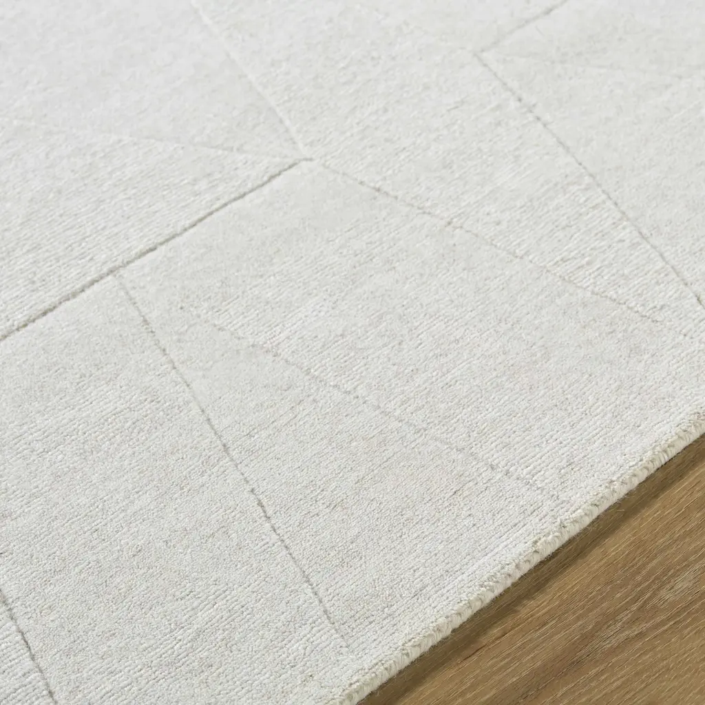 Collection: Callie Colors: Ivory, Pearl, Light Gray Construction: Hand Loomed Material: 100% Wool Pile: Medium Pile Pile Height: 0.31" Styles: Traditional Backing: Canvas Made In: India Thickness: 0.51" Price Range: $$$$$ (Affordable)