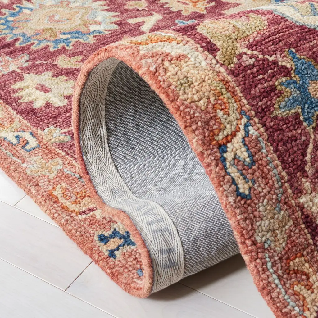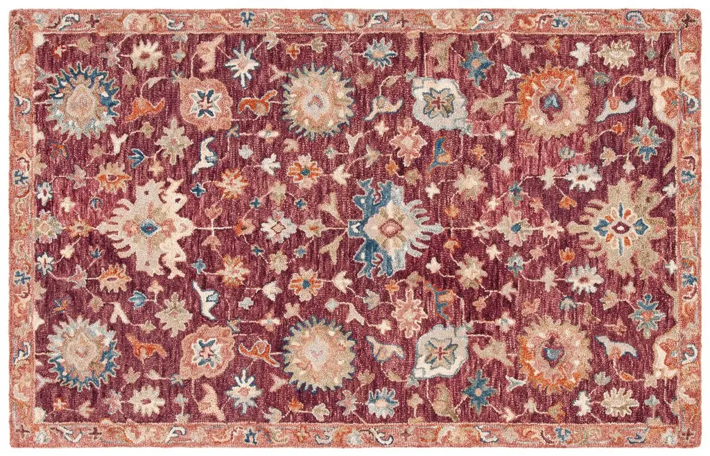 Introducing our exquisite Bohemian-style area rug, a masterpiece of artisanal craftsmanship and timeless design. Measuring 3' X 5' with a cozy 1/2" pile height, this small rectangular rug creates an inviting atmosphere in any room. Hand-tufted in India, this rug boasts a luxurious blend of 85% wool and 15% cotton, offering both durability and softness underfoot. The vibrant red and soft pink tones set a warm and welcoming mood, while the intricate pattern, inspired by boho-chic motifs, adds an element of worldly elegance. The detailed design features a harmonious array of floral and geometric shapes that tell a story of traditional craftsmanship fused with modern aesthetics. Perfect for adding a splash of color and texture to your living space, bedroom, or study, this rug is a statement piece that blends beautifully with both contemporary and classic interiors. Embrace the artistry and cultural richness of this hand-tufted treasure, and let it be the centerpiece of your home decor.