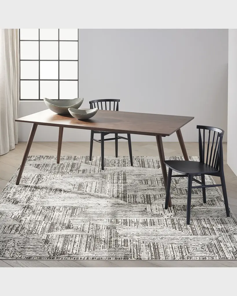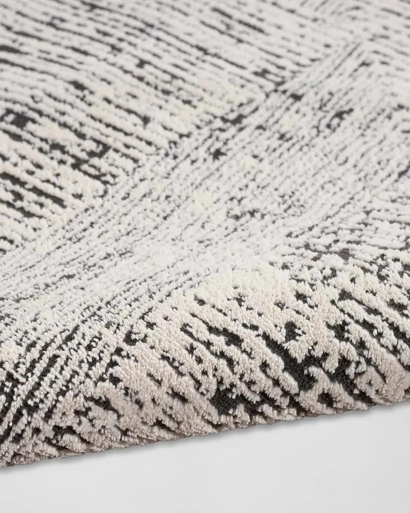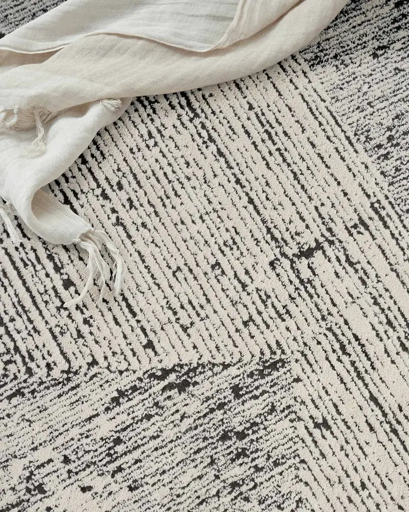 This abstract rug from Nourison and Calvin Klein brings minimalist energy to your home. An overlapping linear pattern, presented in cream and black tones, is enhanced by subtle texture variations and a vivid sheen. Handcrafted of polyester with latex backing Rug measures approx. 7'10" x 9'10" High pile with serged edges Rug height: 0.5" Item Weight (Lbs.): 37.0 Vacuum regularly; professional clean only Size is approximate; we recommend use of a rug pad (not included) Imported Please note: Rugs (especially wool rugs) are prone to a natural shedding process. With regular vacuuming, the shedding will decrease over time. Hand-knotted rugs tend to shed less than hand-tufted rugs, and flatweave rugs will shed less than those with a deeper pile, but all rugs will shed more in high-traffic areas than they do in lower-traffic spaces.Unfortunately, we cannot provide rug swatches at this time. We apologize for the inconvenience. We recommend using a rug pad with every indoor rug to prolong its beauty by minimizing everyday wear and tear and providing a little breathing space to help prevent fiber damage. A pad also helps stabilize the rug, reducing slippage on hard floors. Shipping Direct from Vendor, usually ships within 90 business days. About Calvin Klein: Bronx-born Calvin Klein founded Calvin Klein Inc. as a coat shop in 1968. Since then, Calvin Klein became one of the best-known designer names in the world, offering a modern design aesthetic. The minimalist designs embody elegance and modern sophistication.