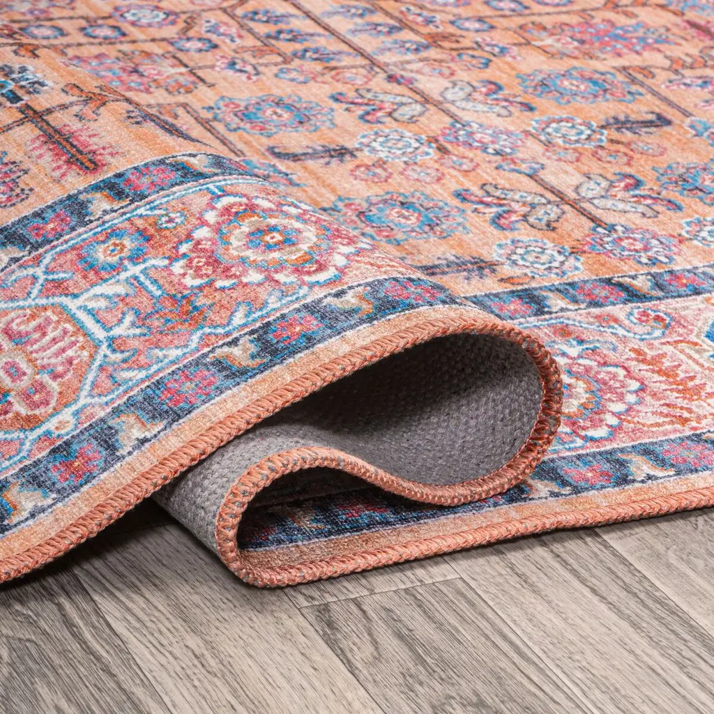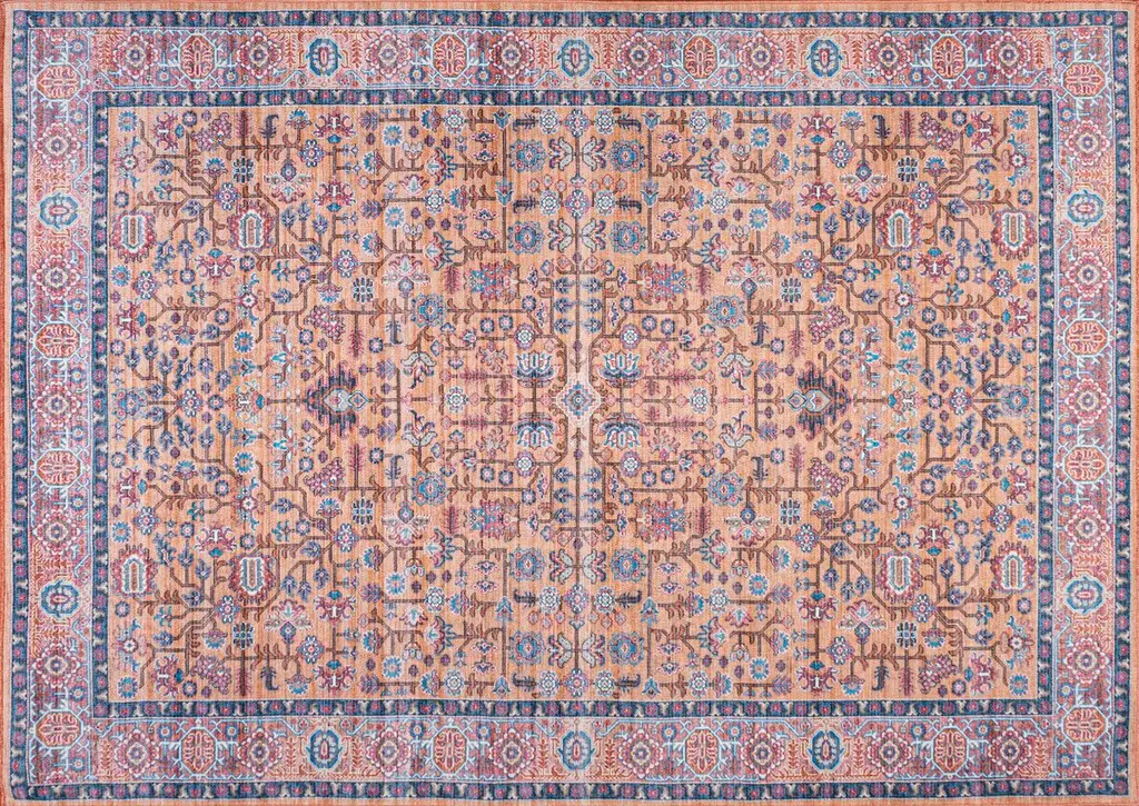 Antique Persian carpets inspired this rug's lavish botanical design. Unlike those venerable floor coverings, however, this polypropylene rug is machine washable for the utimate in convenience. A rug pad is recommended to help prevent slipping and extend the life of the rug.