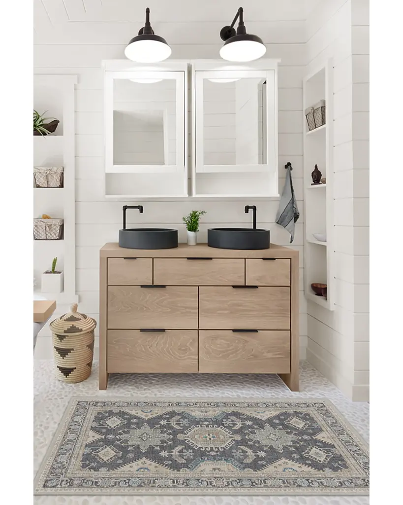 Add a touch of worldly influence to your home with the Cambria Abalone Rug. The intricate pattern of this grey Persian rug design features hues of greige, sage green, and teal with cream accents. Water-resistant, stain-resistant, and machine-washable.