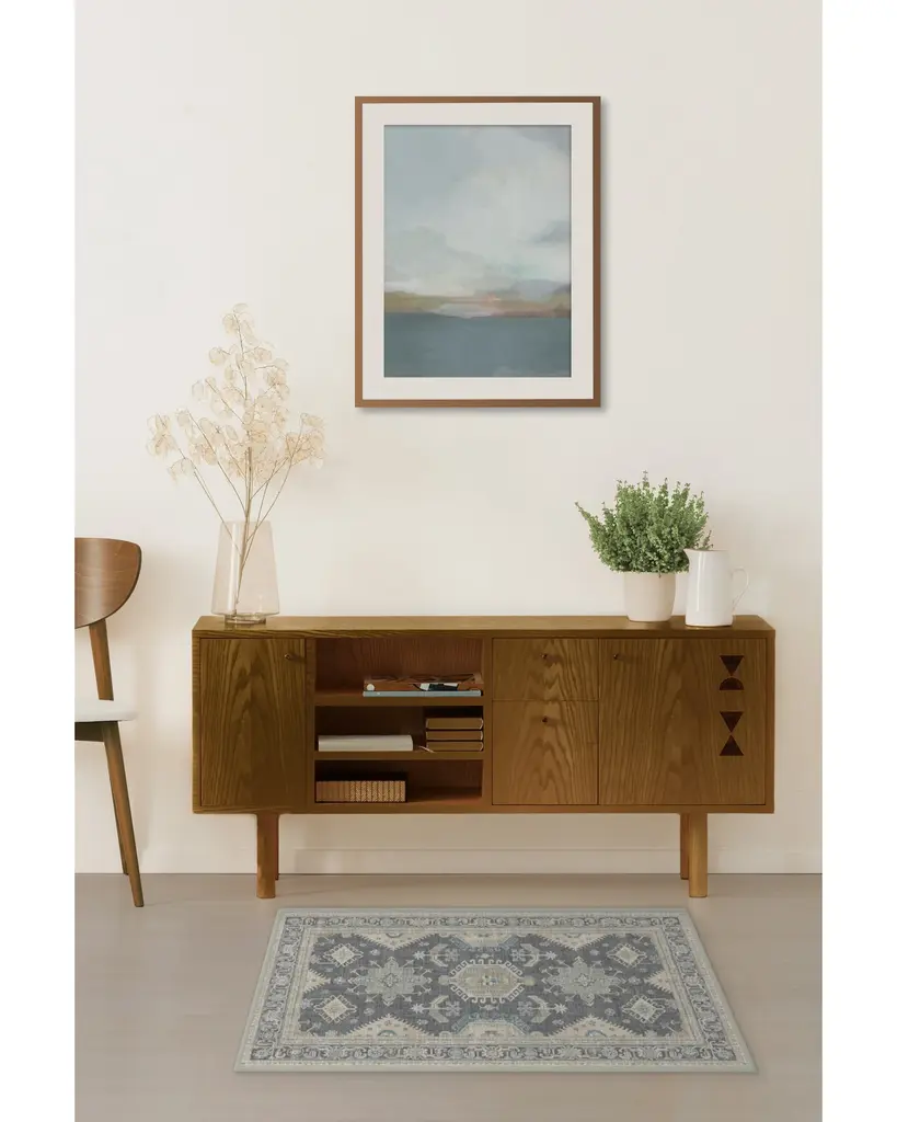 Add a touch of worldly influence to your home with the Cambria Abalone Rug. The intricate pattern of this grey Persian rug design features hues of greige, sage green, and teal with cream accents.
