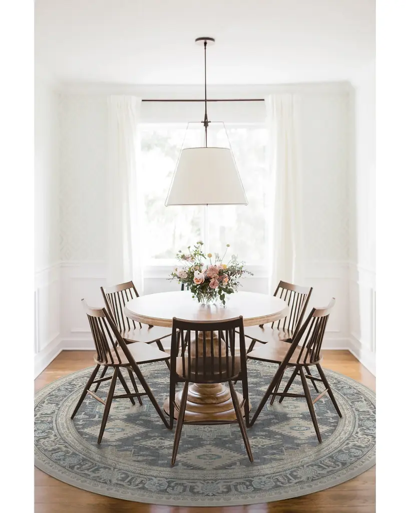 Add a touch of worldly influence to your home with the Cambria Abalone Rug. The intricate pattern of this grey Persian rug design features hues of greige, sage green, and teal with cream accents.