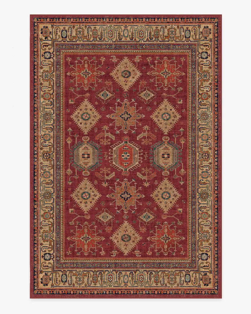 Add worldly influence to your home's interior. Our Cambria Ruby Rug features an intricate pattern reminiscent of a Persian design and is elegantly rendered in hues of ruby red, blood orange, beige, and brown hues. Water-resistant, stain-resistant, and machine-washable.