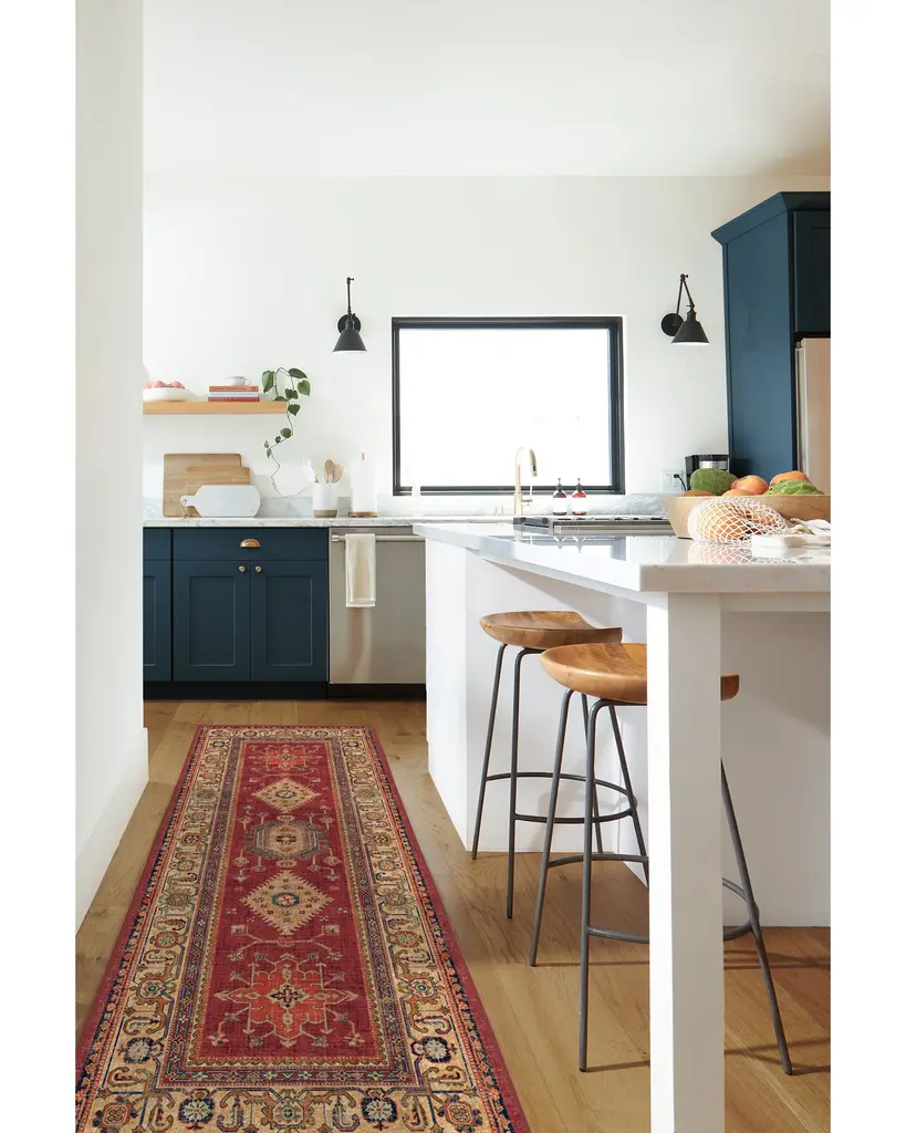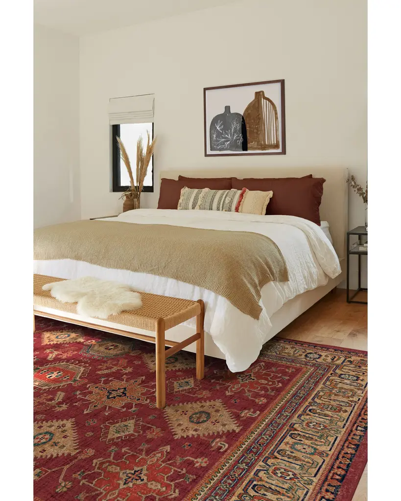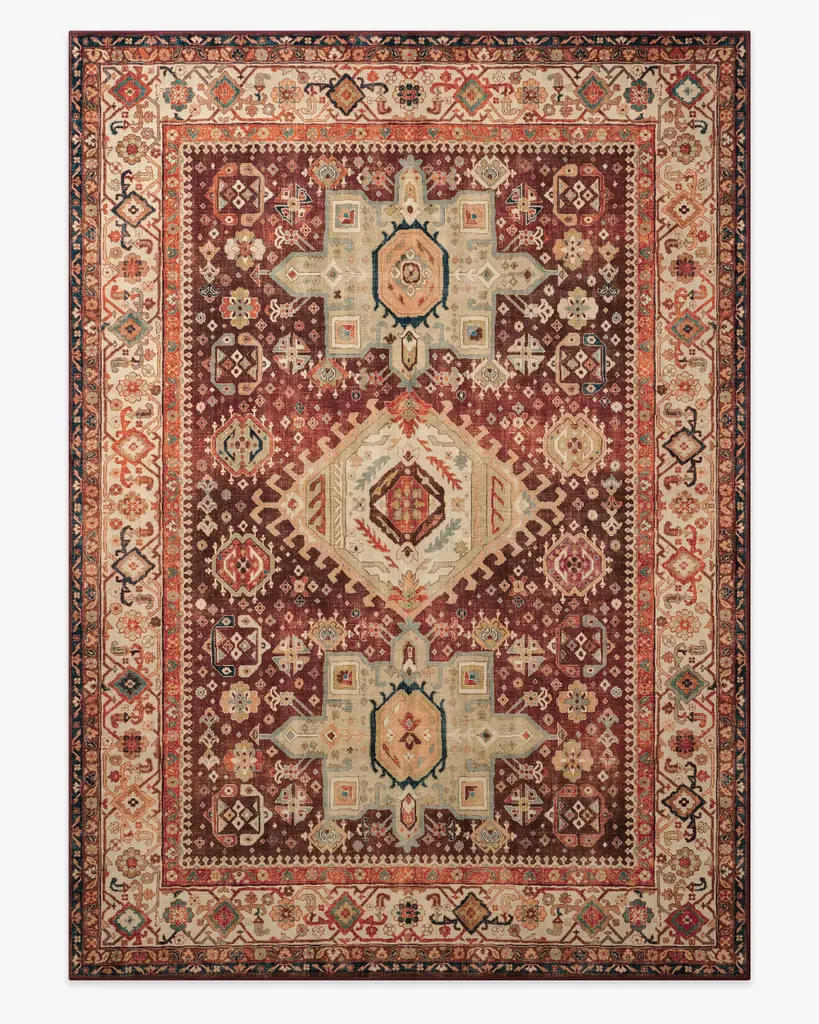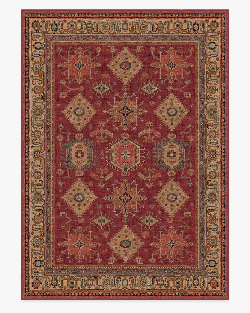 Add worldly influence to your home's interior. Our Cambria Ruby Rug features an intricate pattern reminiscent of a Persian design and is elegantly rendered in hues of ruby red, blood orange, beige, and brown hues. Water-resistant, stain-resistant, and machine-washable.