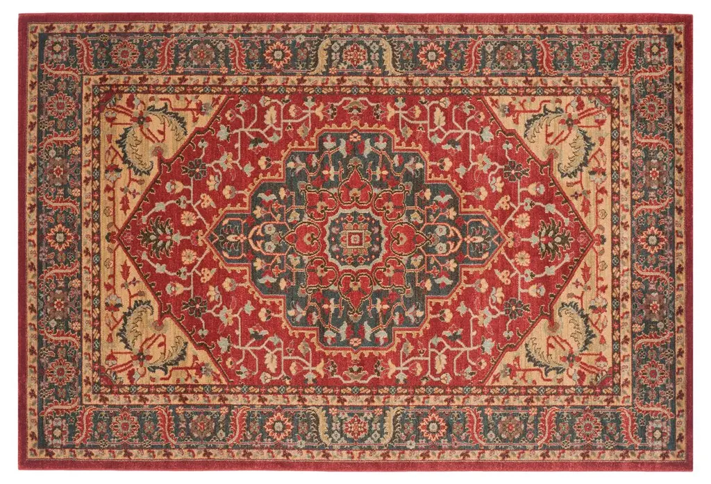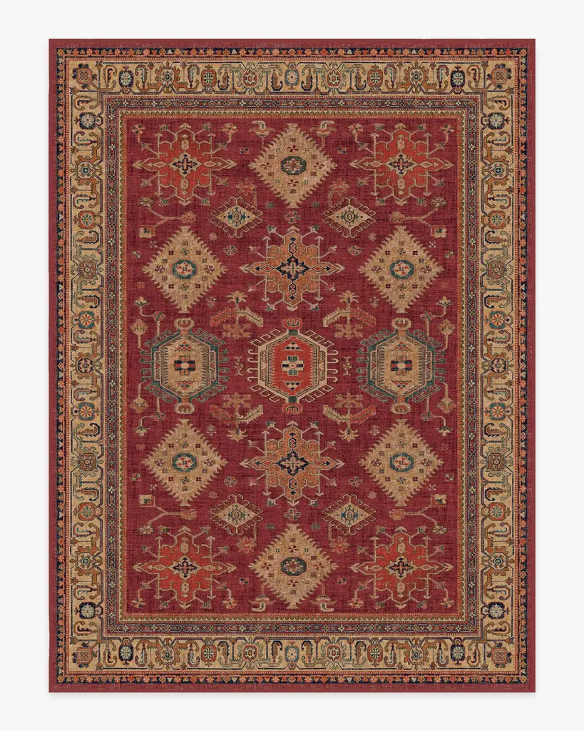 Add worldly influence to your home's interior. Our Cambria Ruby Rug features an intricate pattern reminiscent of a Persian design and is elegantly rendered in hues of ruby red, blood orange, beige, and brown hues. Water-resistant, stain-resistant, and machine-washable.