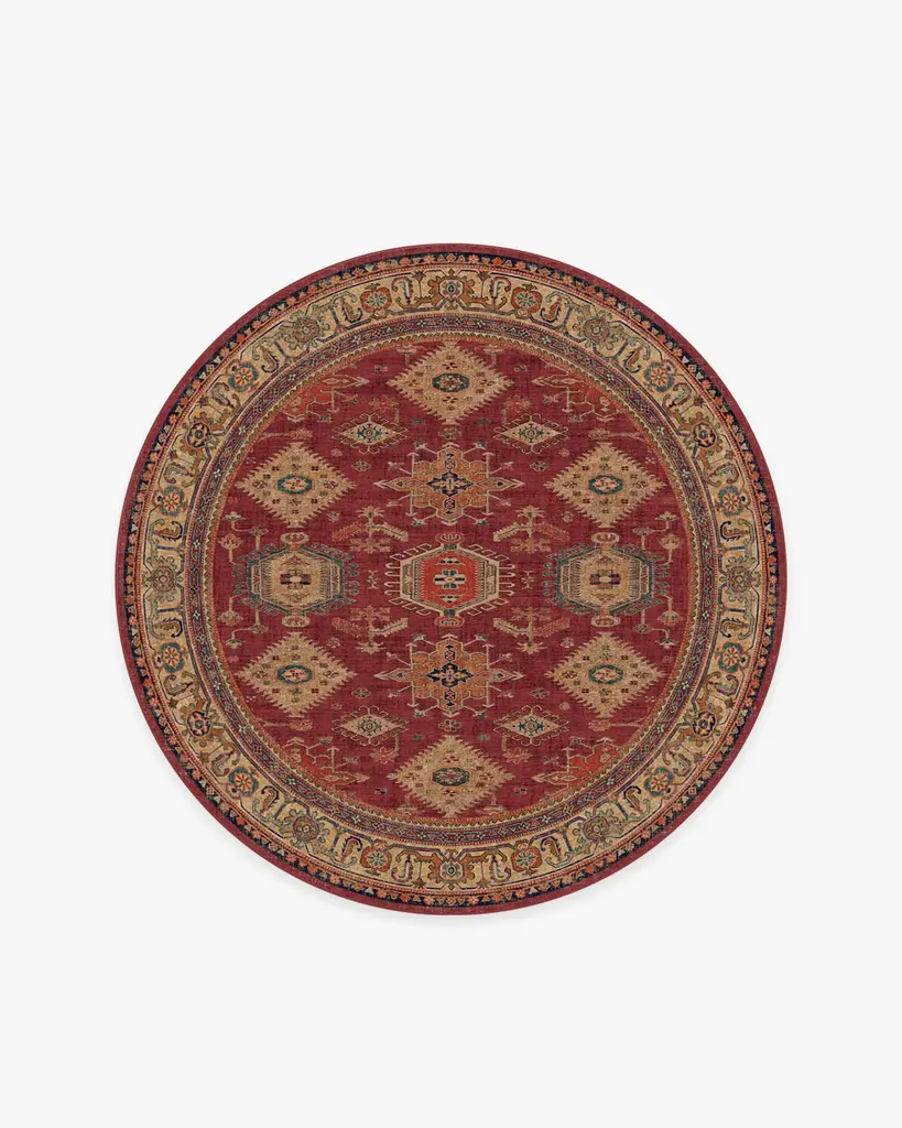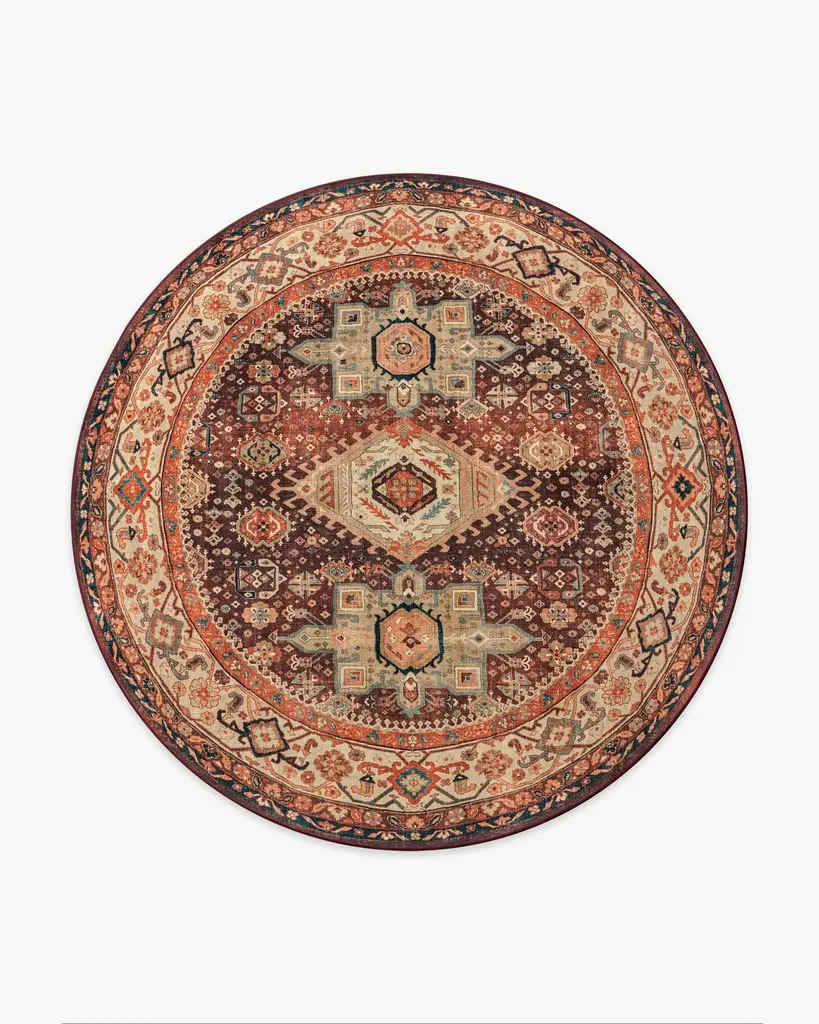 Add worldly influence to your home's interior. Our Cambria Ruby Rug features an intricate pattern reminiscent of a Persian design and is elegantly rendered in hues of ruby red, blood orange, beige, and brown hues. Water-resistant, stain-resistant, and machine-washable.