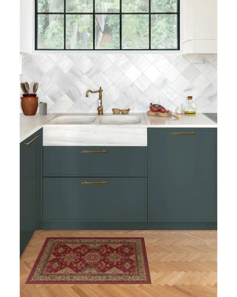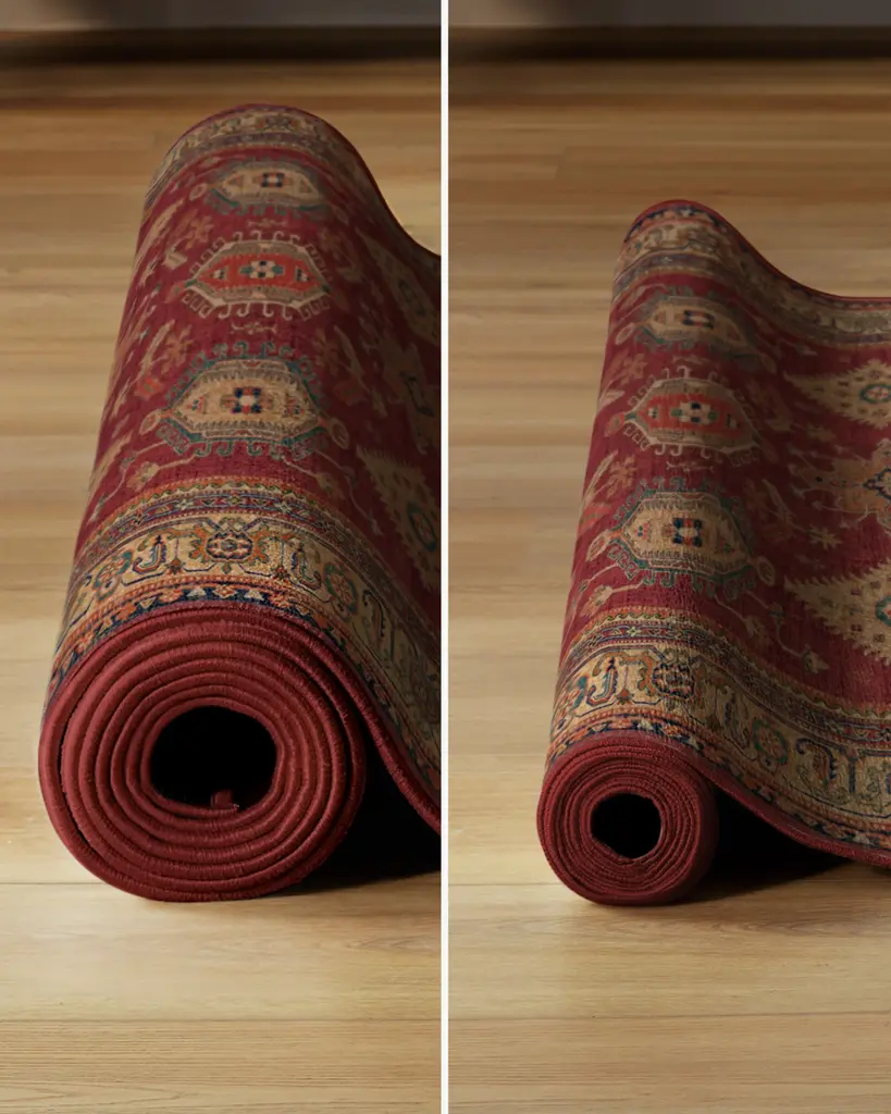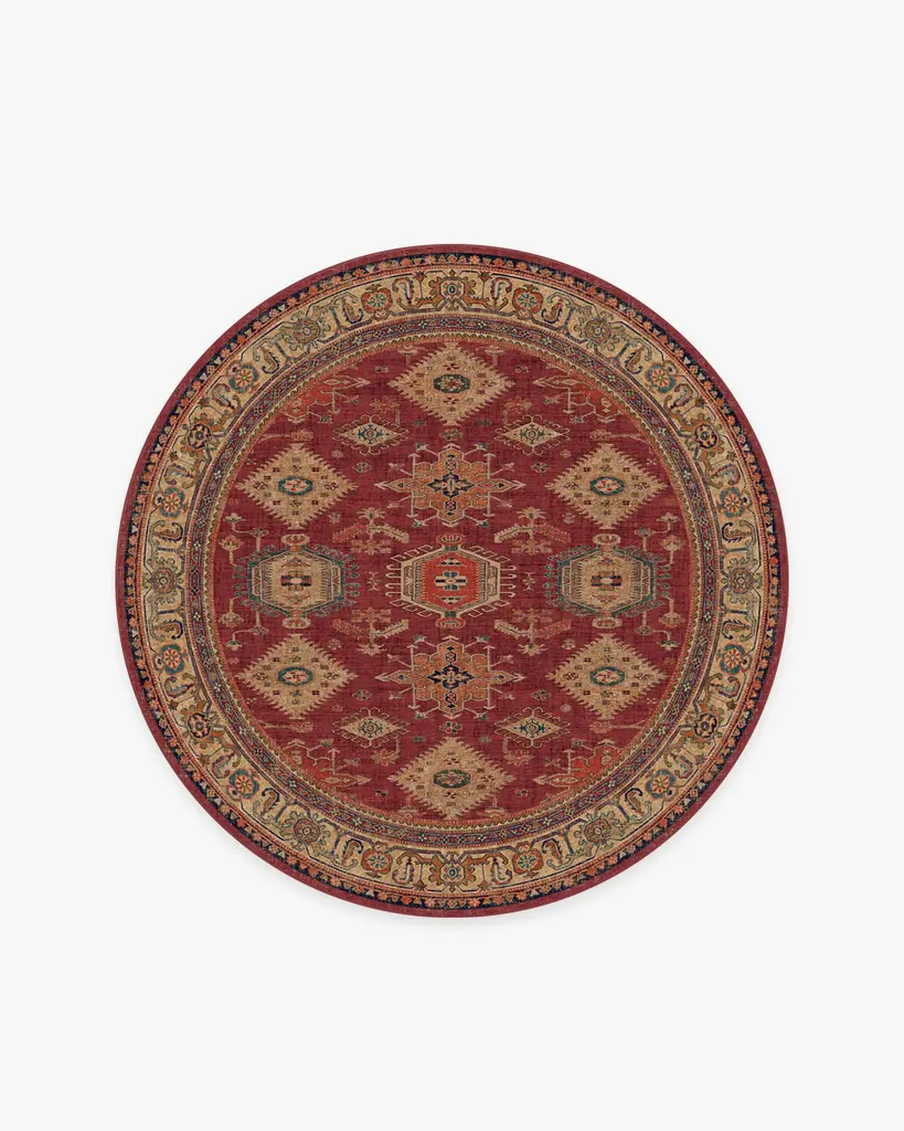 Add worldly influence to your home's interior. Our Cambria Ruby Rug features an intricate pattern reminiscent of a Persian design and is elegantly rendered in hues of ruby red, blood orange, beige, and brown hues. Water-resistant, stain-resistant, and machine-washable.