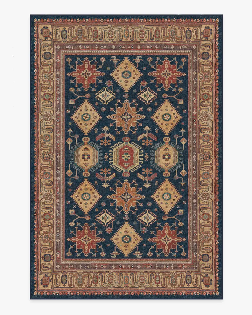 Add culture and worldly charm to your home furnishing with our Cambria Sapphire Rug. This time-honored blue Persian rug design features an intricate pattern of sapphire blue with accents of rust red, orange, and teal, making it the perfect piece to spice up any classic, modern, or rustic-style room. Water-resistant, stain-resistant, and machine-washable.