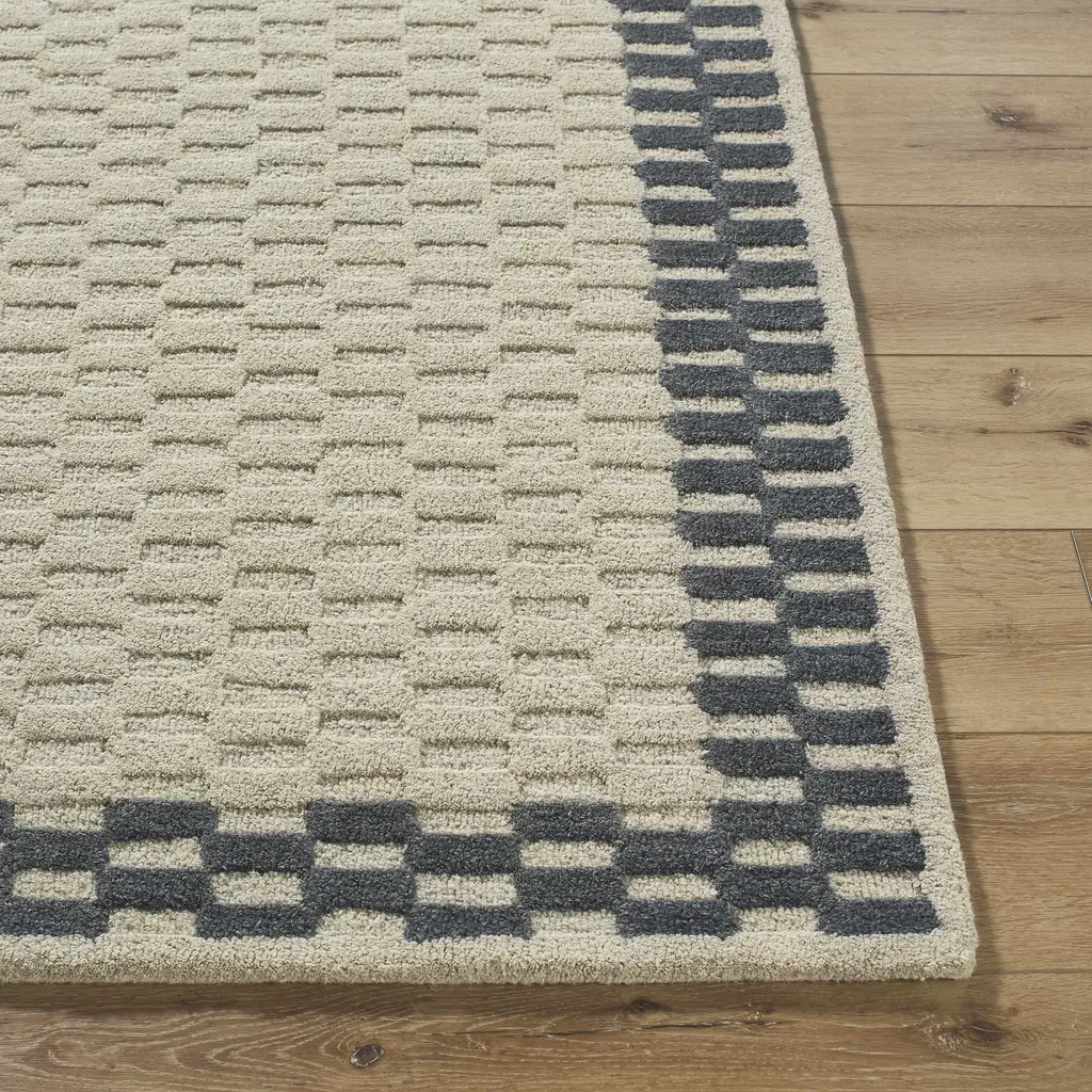 Collection: Camdyn Colors: Ivory, Charcoal Construction: Hand Tufted Material: 100% Wool Pile: Low Pile Pile Height: 0.2" Styles: Contemporary Backing: Canvas Made In: India Thickness: 0.39" Price Range: $$$$$ (Affordable)