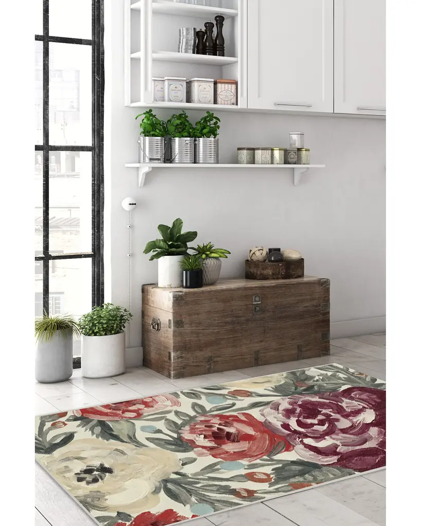Our Camellia Currant rug uses textured brush strokes in pastel hues of red and orange to create a romantic floral motif. Water-resistant, stain-resistant, and machine-washable.