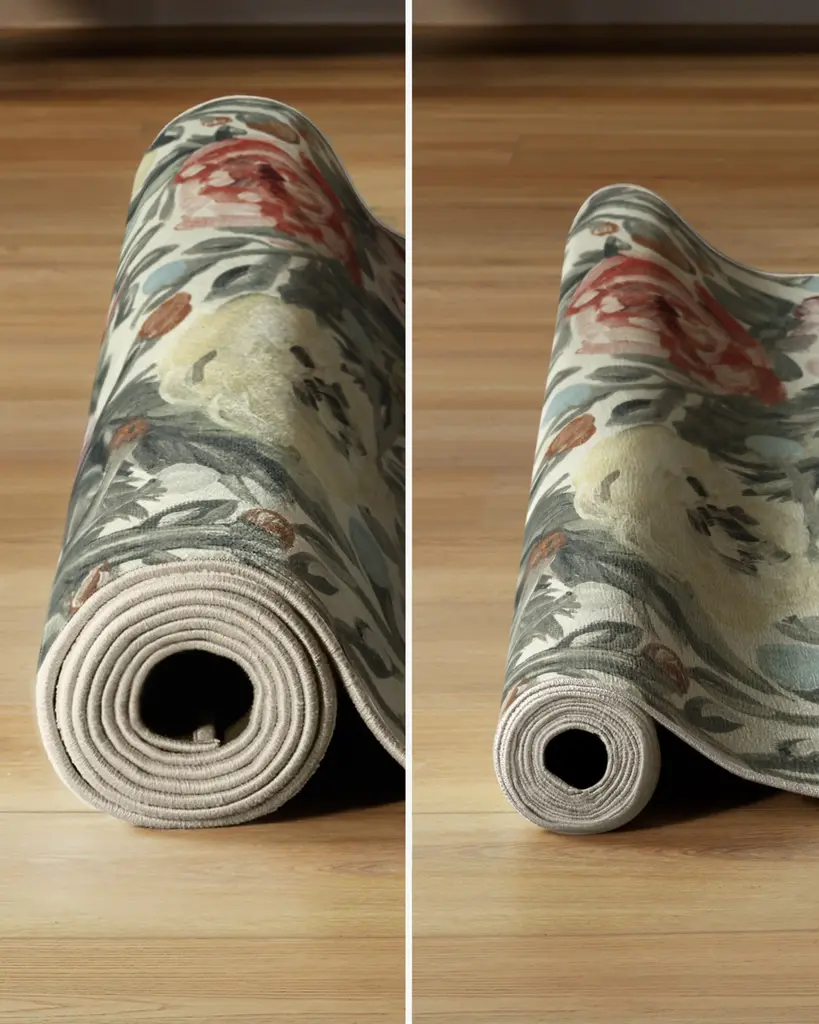 Our Camellia Currant rug uses textured brush strokes in pastel hues of red and orange to create a romantic floral motif. Water-resistant, stain-resistant, and machine-washable.