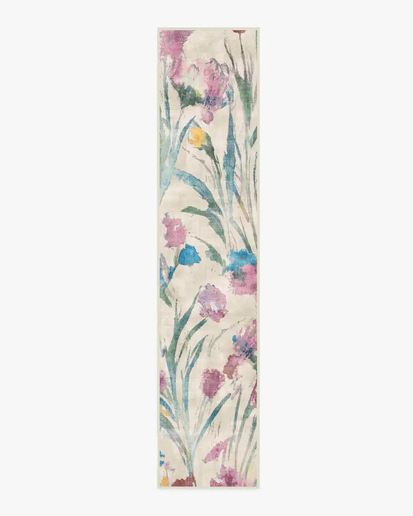 Our Camellia Currant rug uses textured brush strokes in pastel hues of red and orange to create a romantic floral motif.