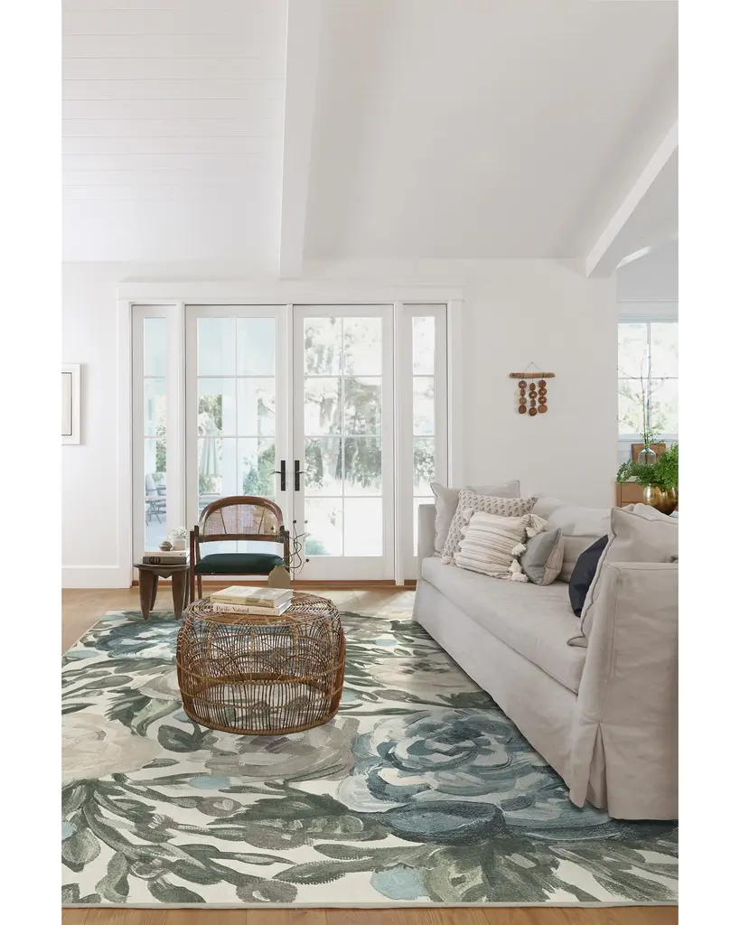Our Camellia Jade rug uses textured brush strokes in pastel colors to create a romantic floral motif. Water-resistant, stain-resistant, and machine-washable. Rug colors may vary slightly according to your device and the lighting in your space.