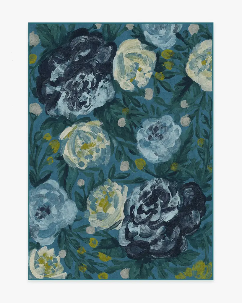 The impressionist-style floral motif of our Camellia Midnight rug is created with textured brush strokes in deep blues and citrus yellows. Water-resistant, stain-resistant, and machine-washable.