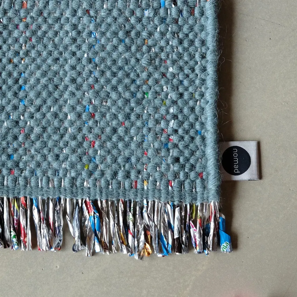 Candy wrapper rug // indoor // German Design Award winnerHere at NOMAD, we believe in innovation, in pushing boundaries and redefining the image of re- and upcycling in the interior industry. Our goal is to create design products with a special feel, a unique look and a meaningful story.The Candy wrapper rug forms the heart of our Nomad collection. It is our initial spark to weave carpets from leftover material. The Candy Wrapper Rug is a woven carpet. The chain is made of candy wrapper (20%) and new wool (80%). The Candy Wrapper Rug adapts to its surroundings. On cloudy days, it looks simple and calm. Daylight, the sun or artificial light make it shine. Almost like a surface of water on which the sun is dancing. Every Candy Wrapper Rug is unique and there is only one in the world.Available in 5 formats and 9 colors. Special formats possible on request.