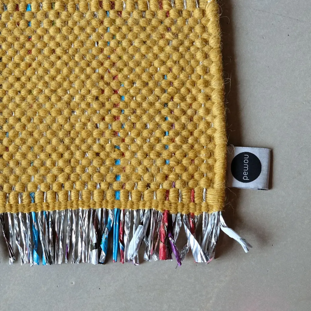 Candy wrapper rug // indoor // German Design Award winnerHere at NOMAD, we believe in innovation, in pushing boundaries and redefining the image of re- and upcycling in the interior industry. Our goal is to create design products with a special feel, a unique look and a meaningful story.The candy wrapper rug forms the heart of our Nomad collection. It is our initial spark to weave carpets from leftover material. The Candy Wrapper Rug is a woven carpet. The chain is made of candy wrapper (20%) and new wool (80%). The Candy Wrapper Rug adapts to its surroundings. On cloudy days, it looks simple and calm. Daylight, the sun or artificial light make it shine. Almost like a surface of water on which the sun is dancing. Every Candy Wrapper Rug is unique and there is only one in the world.Available in 5 formats and 9 colors. Special formats possible on request.