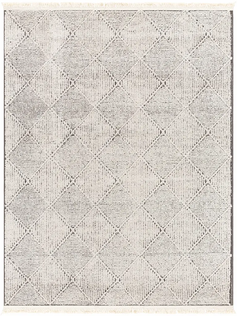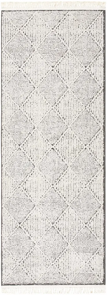 Collection: Cannan Colors: Ivory, Black Construction: Machine Woven Material: Face: 70% Polypropylene, 30% Polyester / Warp: 100% Polyester Pile: Medium Pile Pile Height: 0.31" Styles: Contemporary Made In: Turkey Thickness: 0.39" Fringe Length: 1.18" Price Range: $$$$$ (Affordable)