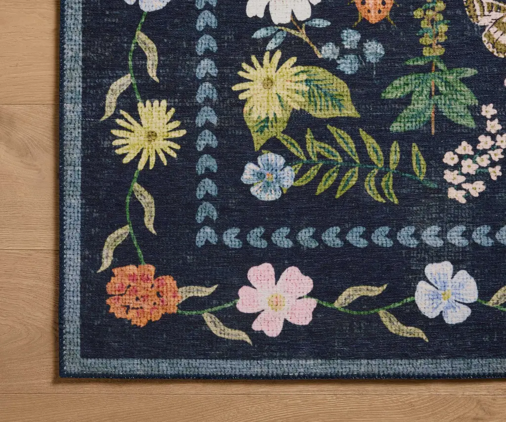 Inspired by nature's tiniest treasures, this luxe interpretation of our Curio print features delicate butterflies, insects, and wildflowers against a bold charcoal backdrop. Drawing on the colors, textures, and creatures of the natural world, the Canopy Collection features lush, forest-inspired patterns, power-loomed in a soft, durable blend of cotton and polyester. Part of our Rifle Paper Co. x Loloi collaboration. Each rug features printed patterns on a soft polyester base that is both colorfast and stain resistant. The layout and scale of our rugs is adjusted to accommodate each available size, and may be different than what is pictured here. Images of each size are available by hovering over the desired size on our desktop site.