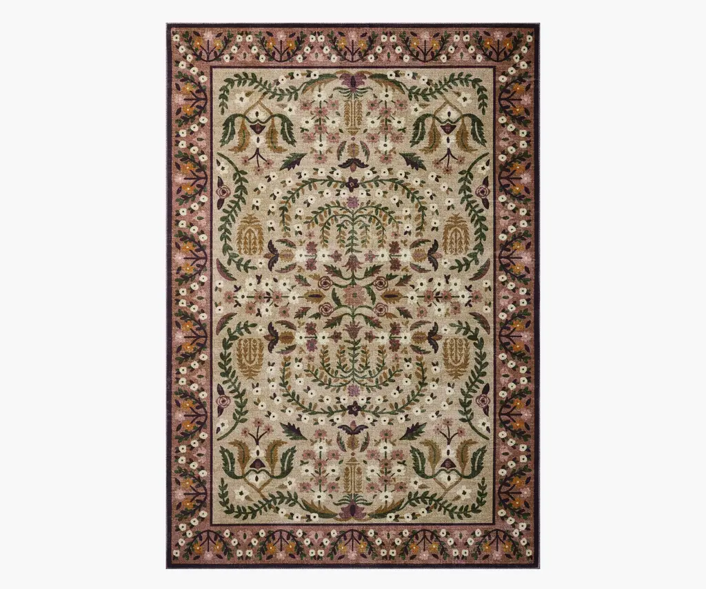 In a warm, earthy hue with aubergine trim, the Edie rug anchors your space with intricate florals and a sophisticated palette. Drawing on the colors, textures, and creatures of the natural world, the Canopy Collection features lush, forest-inspired patterns, power-loomed in a soft, durable blend of cotton and polyester. Part of our Rifle Paper Co. x Loloi collaboration. Each rug features printed patterns on a soft polyester base that is both colorfast and stain resistant. The layout and scale of our rugs is adjusted to accommodate each available size, and may be different than what is pictured here. Images of each size are available by hovering over the desired size on our desktop site.