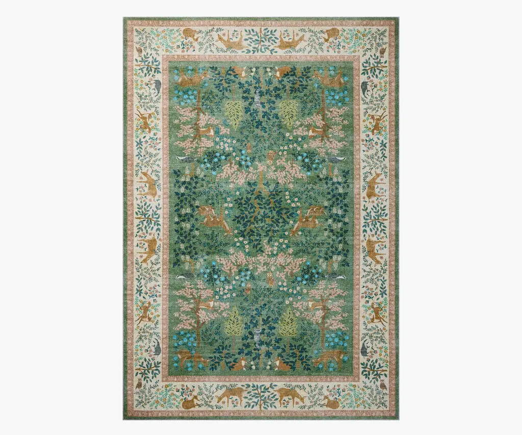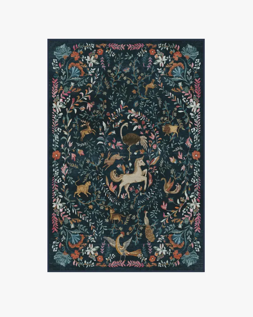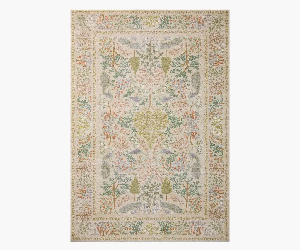 Dramatic peacocks perch throughout an intricate forest scene in this printed rug, a true statement in any space. Drawing on the colors, textures, and creatures of the natural world, the Canopy Collection features lush, forest-inspired patterns, power-loomed in a soft, durable blend of cotton and polyester. Part of our Rifle Paper Co. x Loloi collaboration. Each rug features printed patterns on a soft polyester base that is both colorfast and stain resistant. The layout and scale of our rugs is adjusted to accommodate each available size, and may be different than what is pictured here. Images of each size are available by hovering over the desired size on our desktop site.