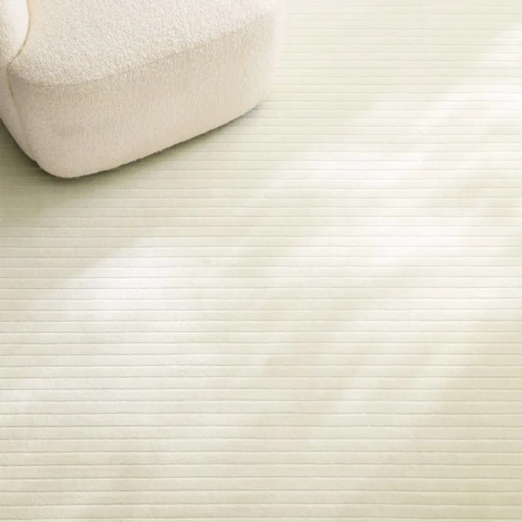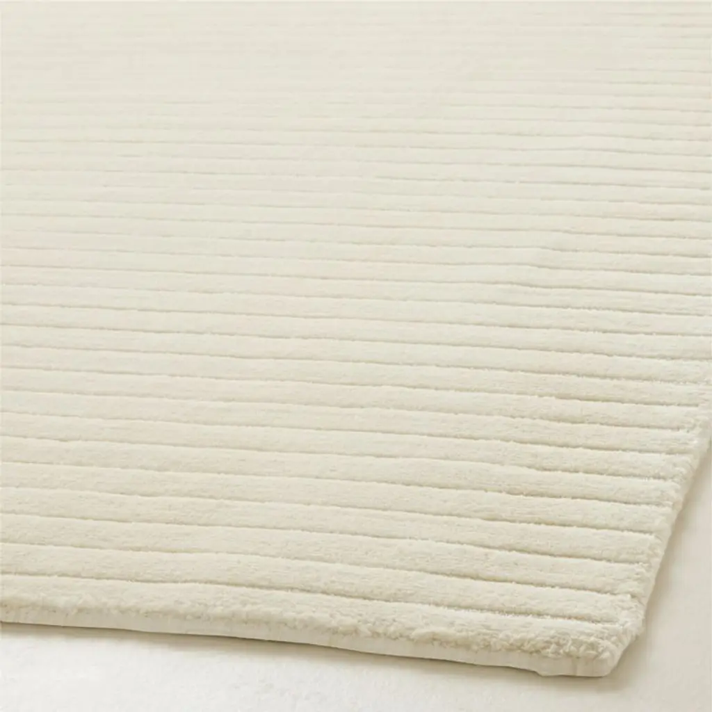 Designed to stand up to daily living in style, this performance rug features channeled stripes that add depth and dimension to its warm white hue. Handloomed double-back construction enhances strength and stability, making it a refined and resilient choice for medium-traffic spaces. CB2 exclusive.How will it look in your room? 12"x12" rug samples are available in stores for a fee refundable upon return of the sample.