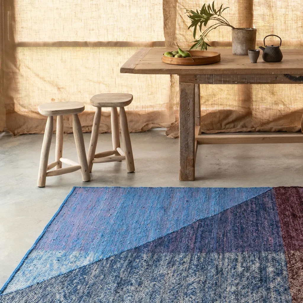 The Capas collection focuses on the creation and use of layers of colors, tonality and shadow to generate intense depth while also being easy enough to blend into any environment, due to the presence of a wide range of chromatic shades. Hahn’s starting point for the Capas collection is his notion of shadows being never black or grey but full of color and geometry. The designer’s aim was to create a simple and light rug that has a casual feel to it while being complex in the use of colors and formation of depth. In order to achieve this, nanimarquina and Hahn intensely studied the specifics of Kilim weaving techniques searching for new ways of distributing color. After months of investigation, Nanimarquina and Hahn developed a new type of loose Kilim structure which allows mixing the colors of the warp and weft. Normally, warp is not visible in a Kilim. By defining a different density of warp new tonalities surfaced, providing a visual texture where colors intertwine with each other along the carpet. The unique texture creates a dark-and-light effect and great profundity without becoming heavy. Like the layers of air in the atmosphere that reflect light and cast shadow. Color is a pivotal element of the Capas collection. Each rug has a main color, a complementing tone and its darker gradient which in the composition gives the illusion of a cast shadow on the floor. Each rug is a color chord of a certain main color.