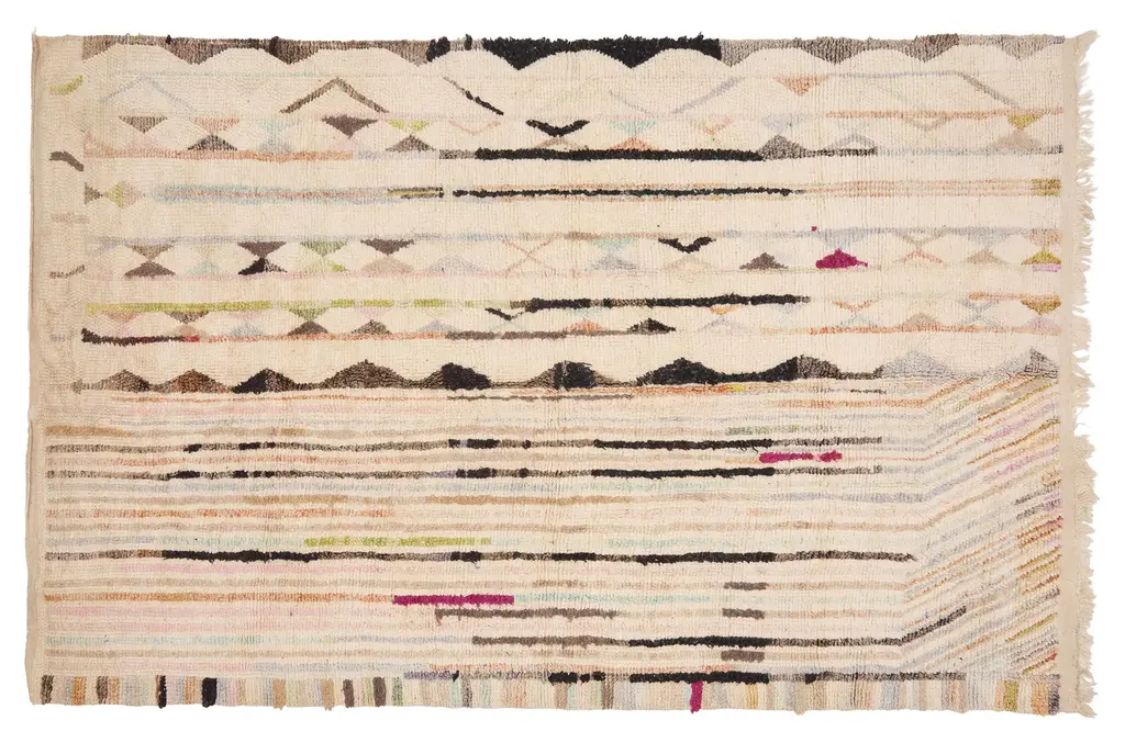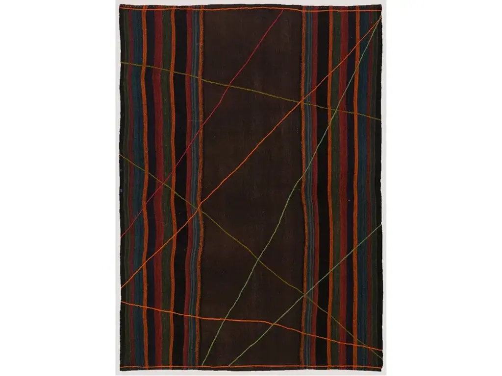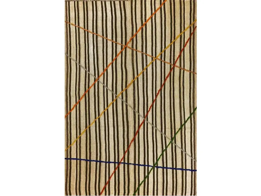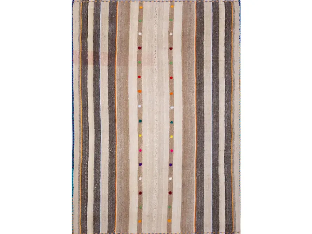 Caprino 18 is a rectangular wool rug.Caprino flatweaves are made of Goat’s Hair, hence the name. They are weather and water resistance since they were principally used to line the walls and ceilings of nomadic tents. The designs are minimalist… mainly stripes and usually made using undyed Goat's Hair, with occasional highlights of thin coloured stripes. The colourful selvedges and pompoms are a Zollanvari touch. Highly adaptable… highly decorative…The tribal flatweaves or kilims (known as gelims in Farsi) are traditional colourful weavings with bold geometric and floral designs. They are woven by Luri and Ghashgha’i nomads who interpret centuries’ old designs and motifs that have been handed down from generation to generation.