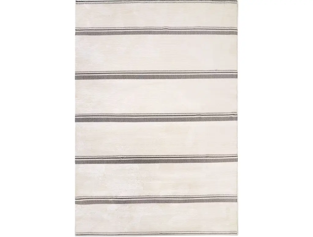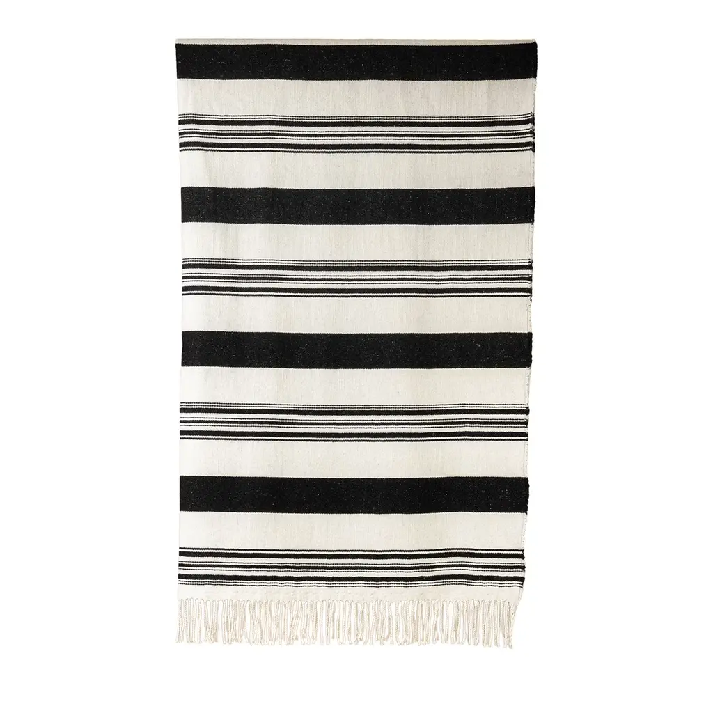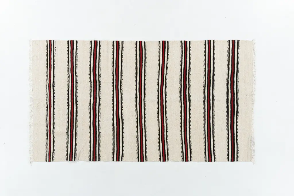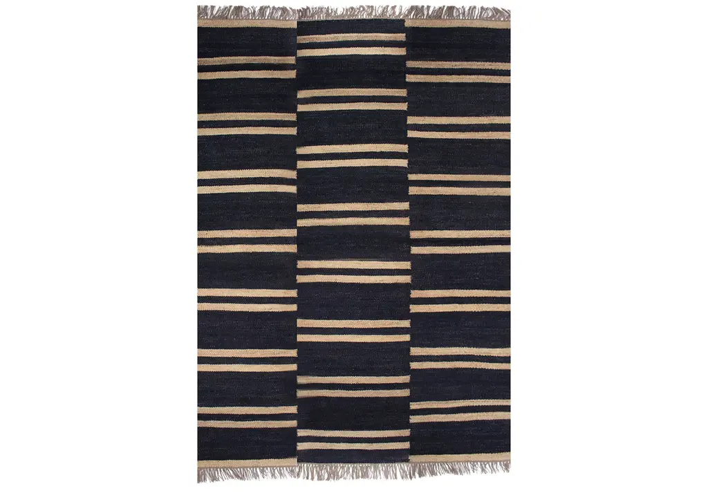 Caprino 4 is a rectangular rug in wool.Caprino flatweaves are made of Goat’s Hair, hence the name. They are weather and water resistance since they were principally used to line the walls and ceilings of nomadic tents. The designs are minimalist… mainly stripes and usually made using undyed Goat's Hair, with occasional highlights of thin coloured stripes. The colourful selvedges and pompoms are a Zollanvari touch. Highly adaptable… highly decorative…Zollanvari ‘minimalist’ kilims are diverse. Baneh kilims are woven in northern regions in sections using natural undyed wools and then skilfully stitched together. The one-piece Zagros kilims woven by the Luri and Ghashgha’i nomads are monochromatic. They have traditional ‘lazy lines’ that form subtle patterns of diamonds and squares. Maryam kilims, woven by the same tribes, have plain ground colours with repeat motifs hand-embroidered in pure silk, awarded Best Innovation at the CDAs in 2009. The jewel in the crown of our ‘minimalist’ flatweaves is a collection that draws inspiration from the old and antique Mazandaran kilims that have appeared on the market in the past decade – a truly modern collection. Caprino is a new flatweave collection woven from undyed goat’s hair on which pile-knotted erratic modernist lines in bright colours are superimposed.